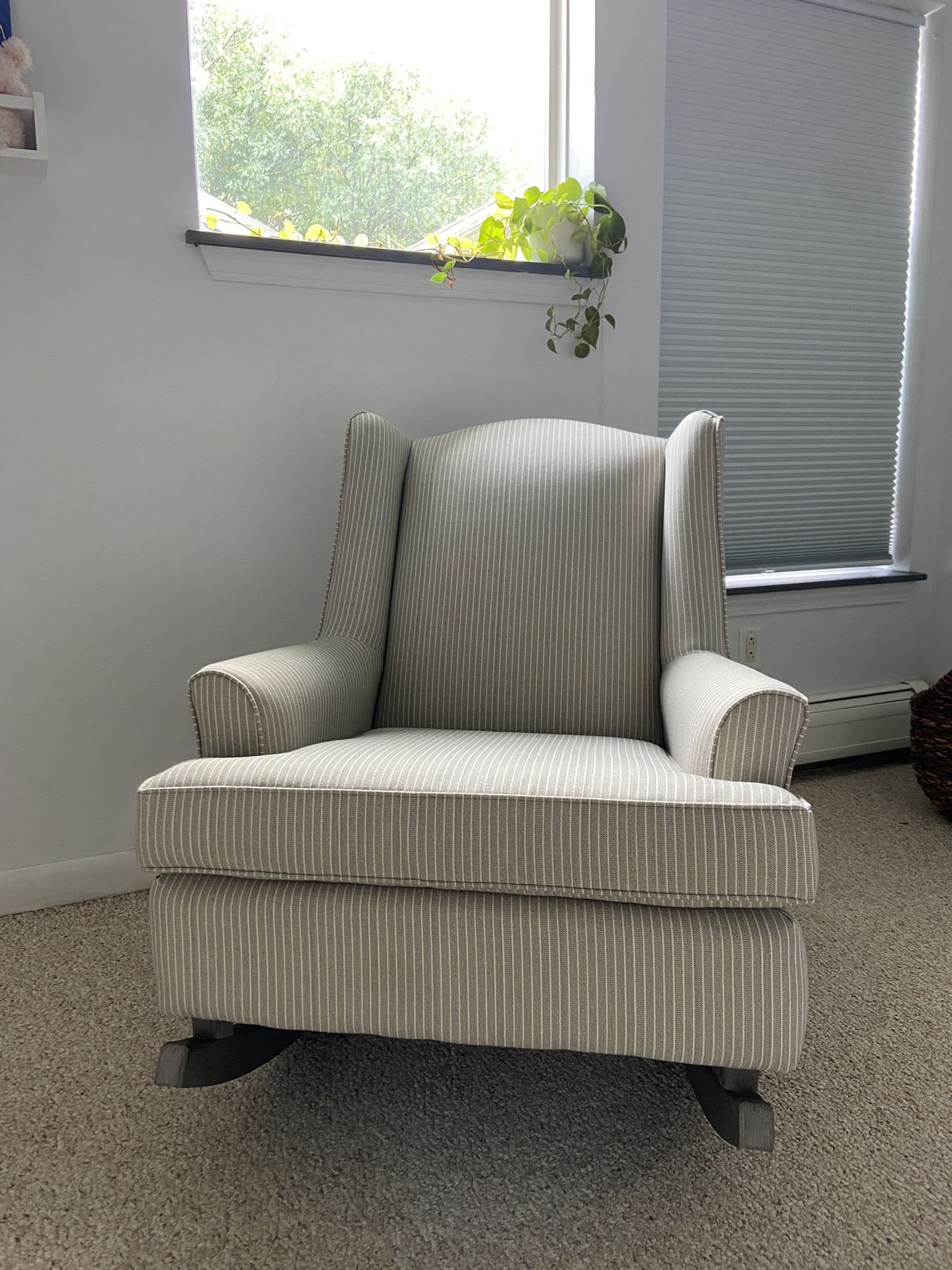 Excellent condition nursery rocker chair. Beautiful grey and pinstripe fabric. Bought for full retail price $500/600 at raymour and flanigan. Accepting offers.