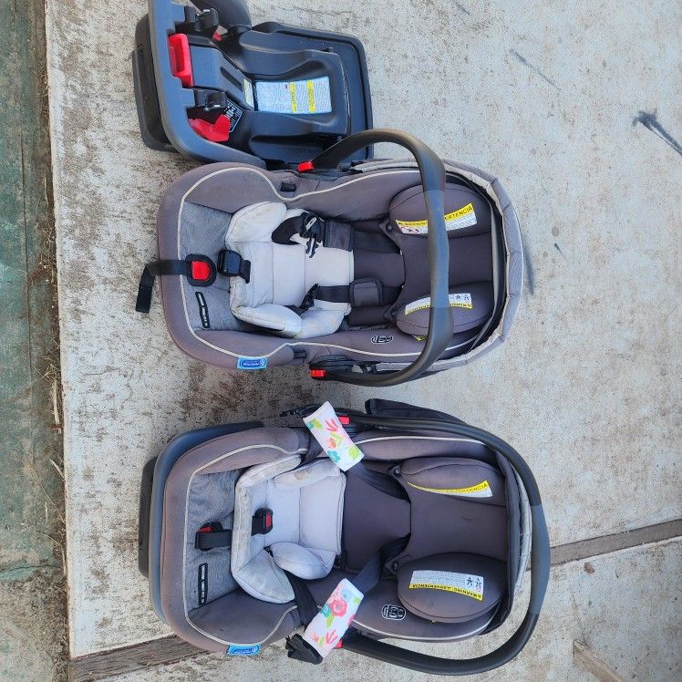 Each carseat comes with the base. These are super safe carseats which is why we got them. They are so easy to install in the car! The cushions are easy to toss in the washer to clean up. Sell new for ~200 each. Asking 100 total or $50 each.
