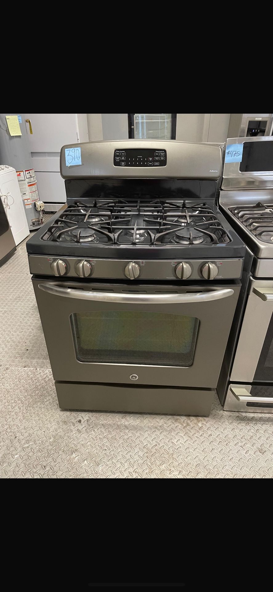 GE 30” Black and Chrome Gas Stove. It is gently used/in excellent working condition. 30 day warranty. Delivery options are available to a 1st floor only for a delivery fee.