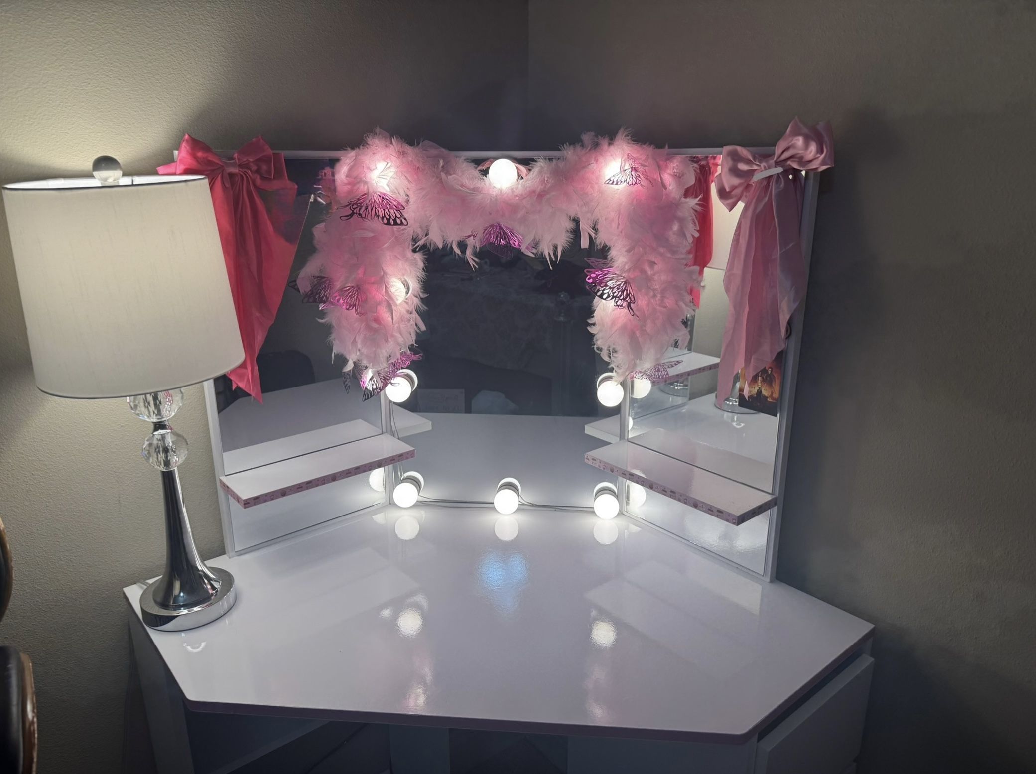 White wood dresser with 4 drawers and dimmable/ warm-cold lights. I put cold light for the picture. Accessories not included.