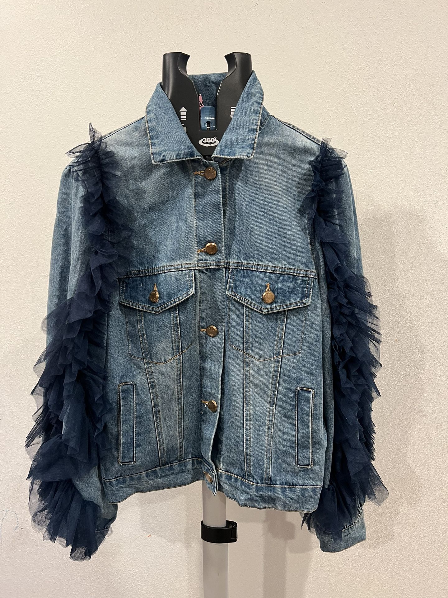 Long sleeve denim jacket with ruffle trim sleeve. One size fits most. *Bust: 44 inches; Length: 24.75 inches; Shoulder: 15.75 inches; Sleeve: 27.5