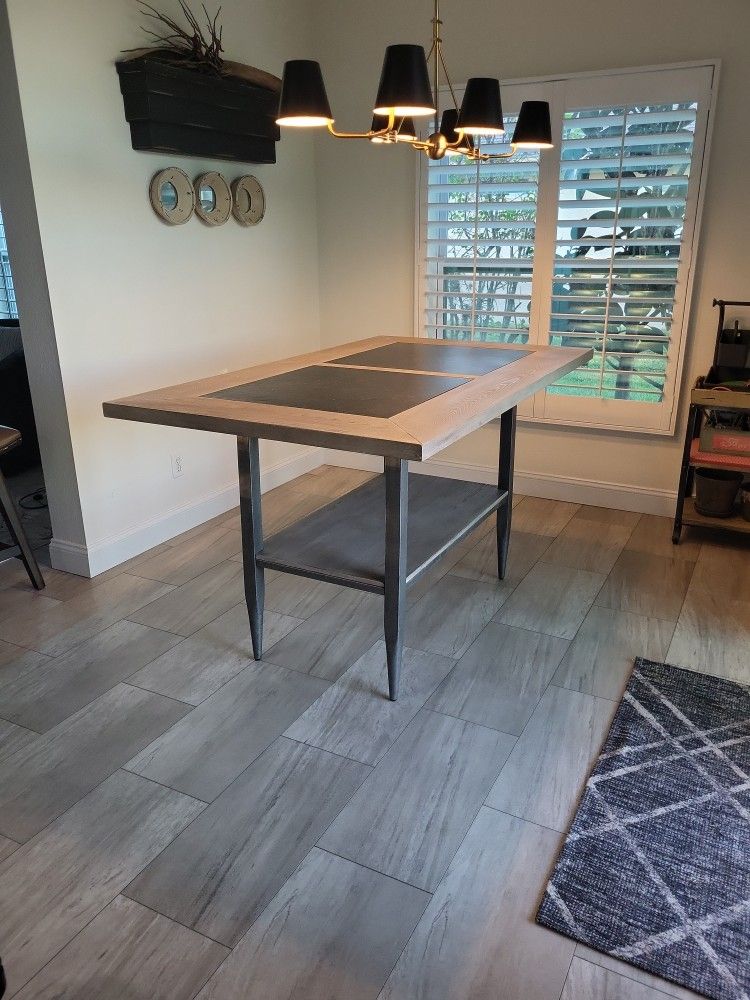 Counter Height table...64"l x38"w x36"h...slate inlay with solid wood surround, metal base with shelf below...excellent condition.