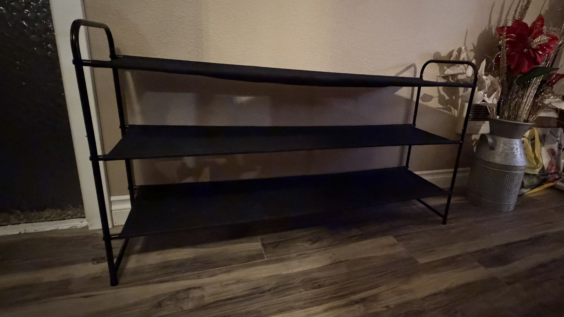 Black metal and cloth shoe rack. Gently used. $15 OBO.