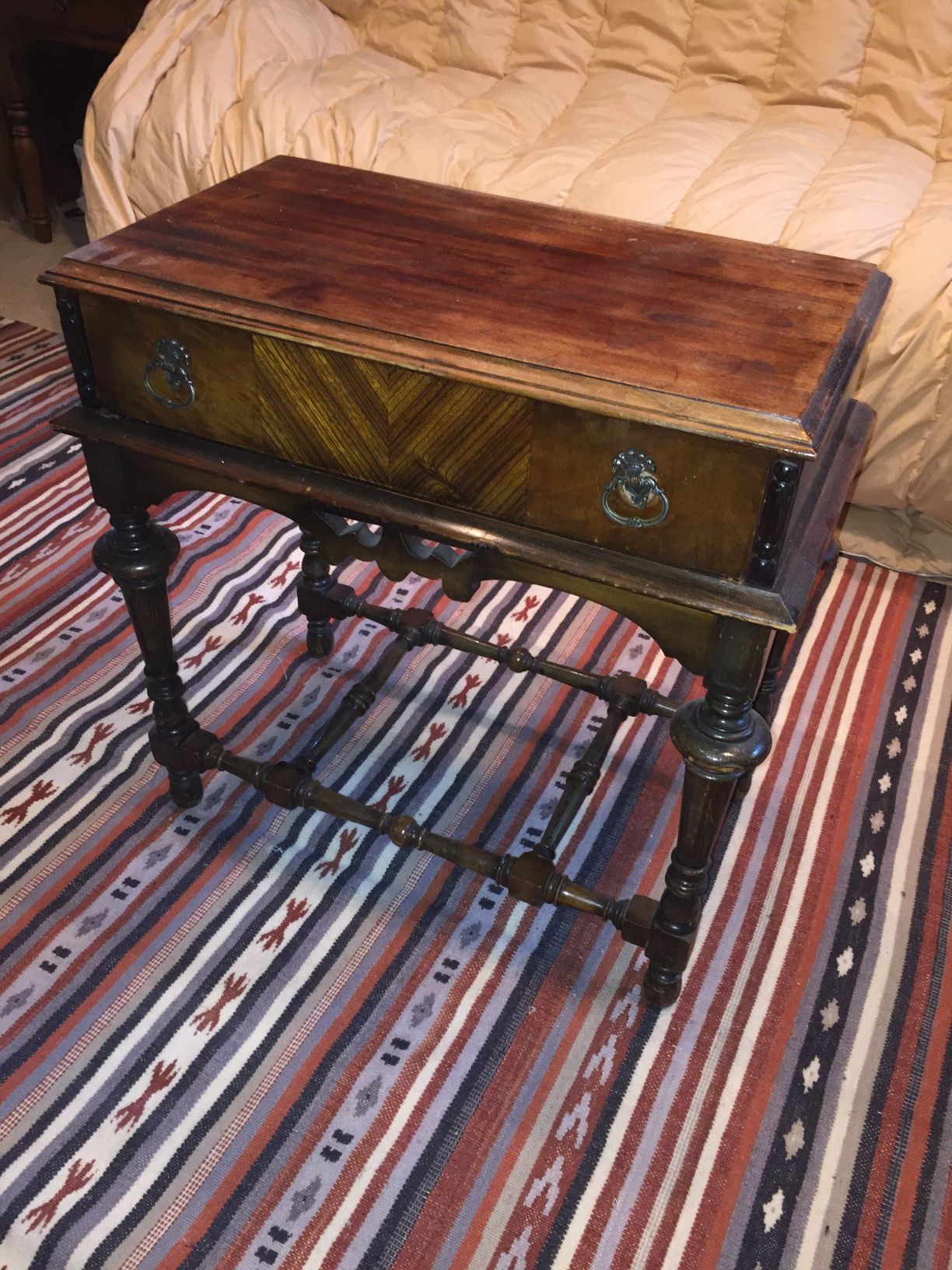 24" high by 28" wide by 24" high antique walnut side table with drawer
