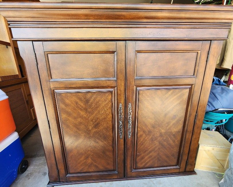We have a two piece Armoire for sale. The base is 32"h x 22 1/2"d x 51"w, the top is 50"h x 24"d x 54"w. It is a nice piece and well made. Pick up and cash only. Thank you.