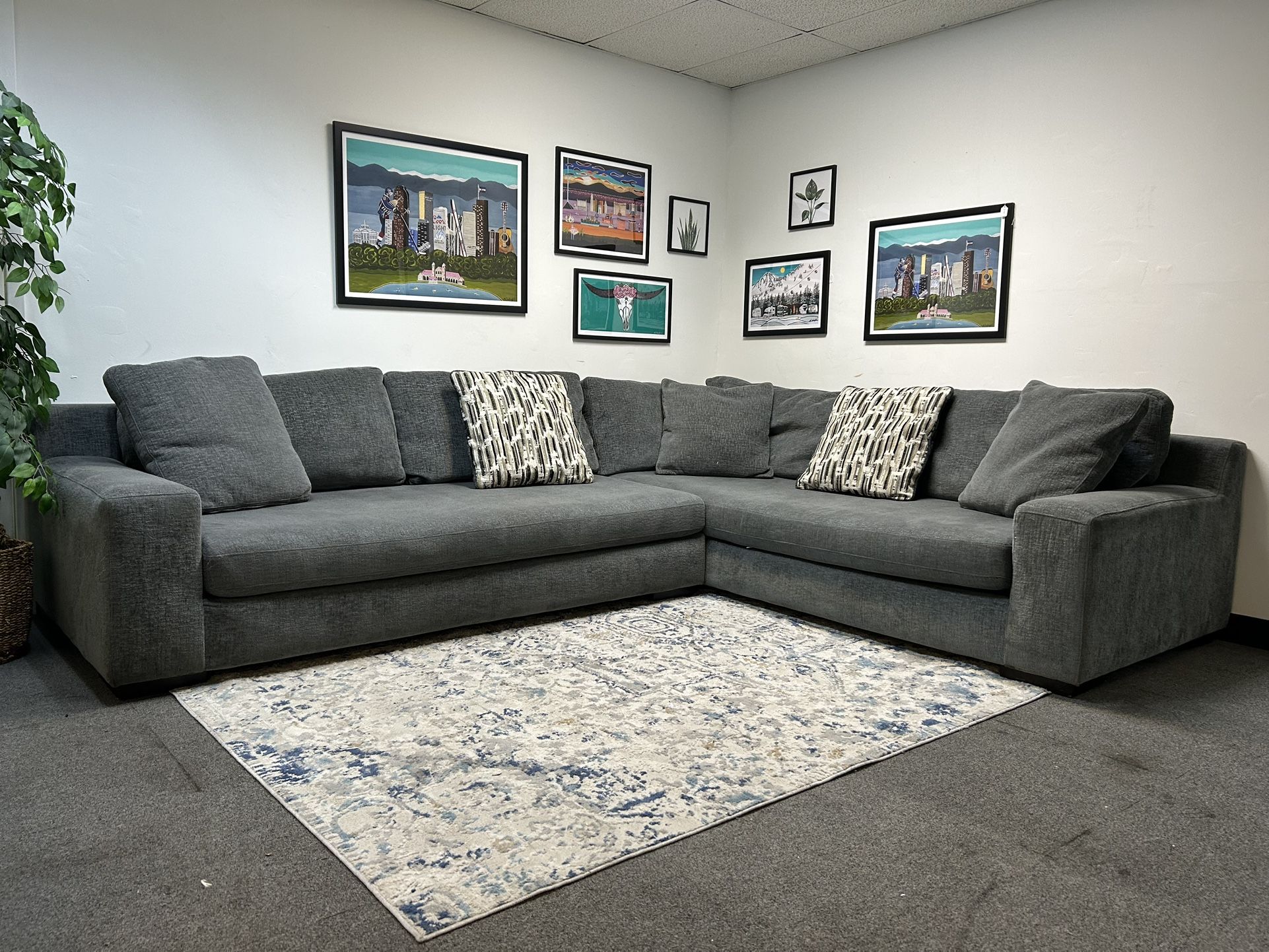 Excellent, like-new (MINT) condition 2-piece modern gray cloth Kroehler brand bench seat sectional measuring 125''x104''x46''x29''. Extra deep seats and comfortable material makes for an ideal lounging experience for friends and family alike. We are Instant Offer Furniture are used furniture store based in Denver Shop online or at our showroom. We are open Monday to Friday 9 AM to 5 PM and my appointment Saturday join our Facebook group Instant Offer Furniture LLC for first dibs on new inventory price does not include sales tax. tags: gray sectional, modern gray sectional, contemporary gray sectional, 2-piece sectional, large sectional, deep sectional, gray cloth sectional, comfortable gray sectional