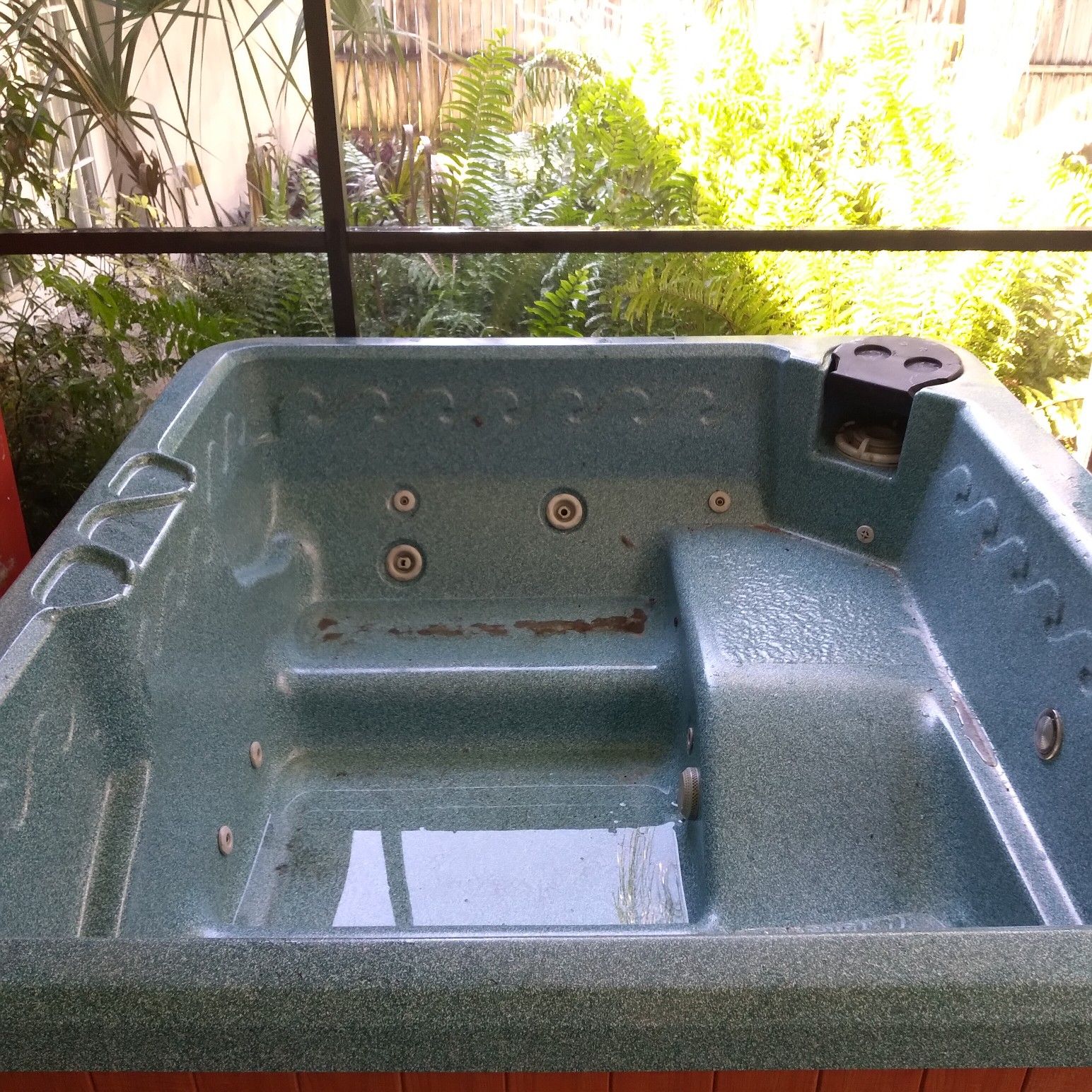 Hydro Spa:/ With Cover Dim: 6' x 6" x 30" tall w/ vinyl cabinet-comfortably seats 5 with a lounger and light- all worked perfect when shut down last year-moving must go-purchaser must haul.