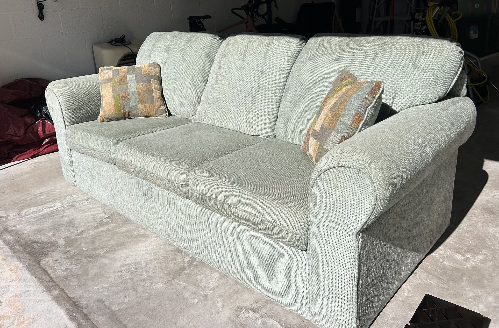 $120 OBO Comfortable and stylish 3-seat sofa in perfect condition. Upholstered in a soft, light green fabric that’s neutral and easy to match with any décor. Cushions are plush, supportive, and hold their shape well. No stains, rips, odors, or wear. This couch has been well cared for and looks great. Perfect for a living room, apartment, basement, or guest space. Comes with two coordinating accent pillows. Dimensions: Length: 80 inches Width: 36 inches Height (floor to top of cushion): 34 inches Ready for pickup and needs to go ASAP. A great, clean couch at a great value. 📍Pickup in Safety Harbor