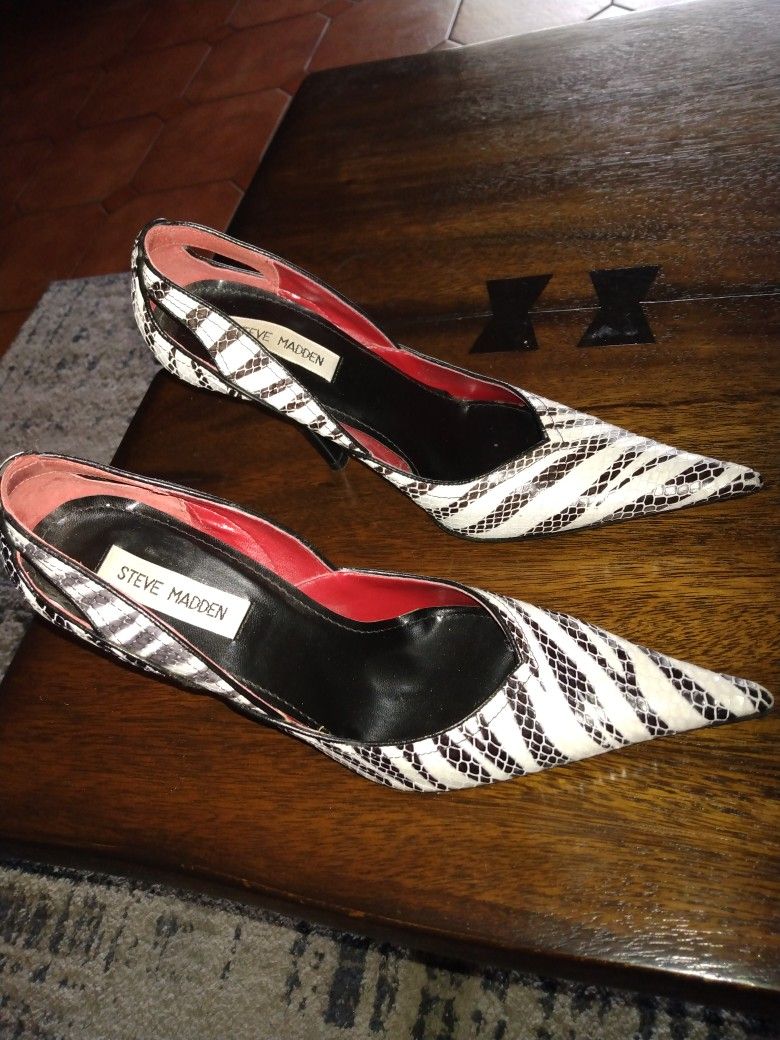 Gently used women's zebra heels. Department:Women Material:Genuine Leather Heel Height:High Heel 3" Toe Style:Pointed Toe STEVE MADDEN "Liquid" Leather Zebra Animal Print Pointed Toe Stilettos Patent Leather Heels. Great pre-owned condition- almost brand new. Steve Madden Shoes | Steve Madden Zebra Snakeskin Stiletto Heel (8m) | Color: Black/White