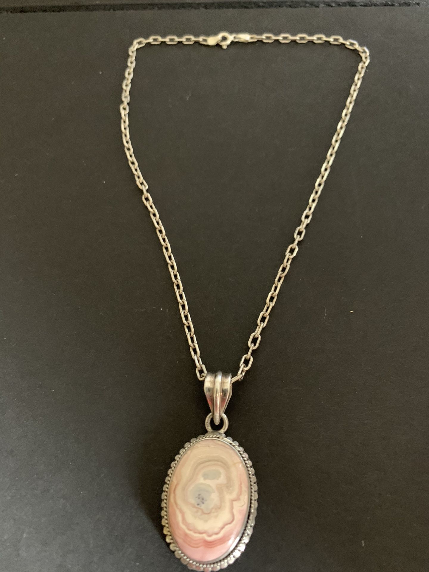 Silver 925 stamped necklace with pink rhodonite pendant 19” inches long