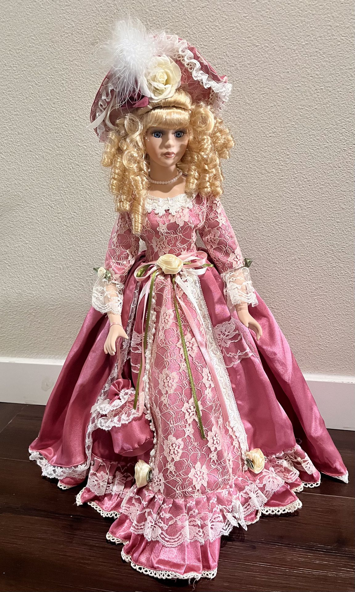 pink porcelain vintage doll Vintage-style porcelain doll in beautiful condition, dressed in an elegant pink lace gown with detailed trim and ribbon accents. She features soft blonde curls, bright blue eyes, and a matching bonnet adorned with flowers and feathers, giving her a timeless, classic look. Her outfit includes delicate lace layers, satin fabric, and a small matching purse, making her a stunning display piece for a shelf, bedroom, or collector's space. The craftsmanship and intricate details make her stand out and add a touch of charm wherever she's placed. Perfect for collectors. She is about 21 inches tall.