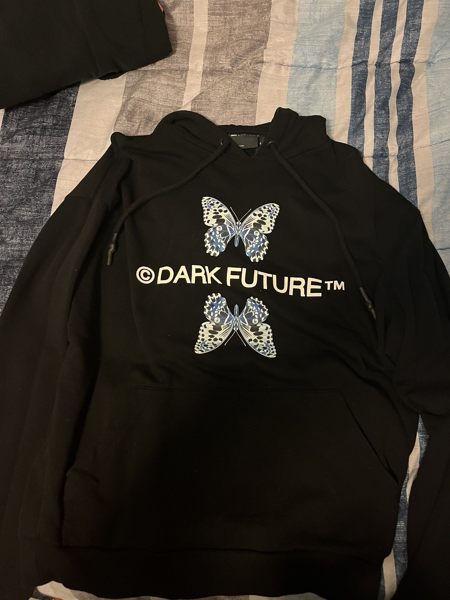 -black hoodie with white writing and navy blue butterflies -size: xs -no tears or stains -plain on back