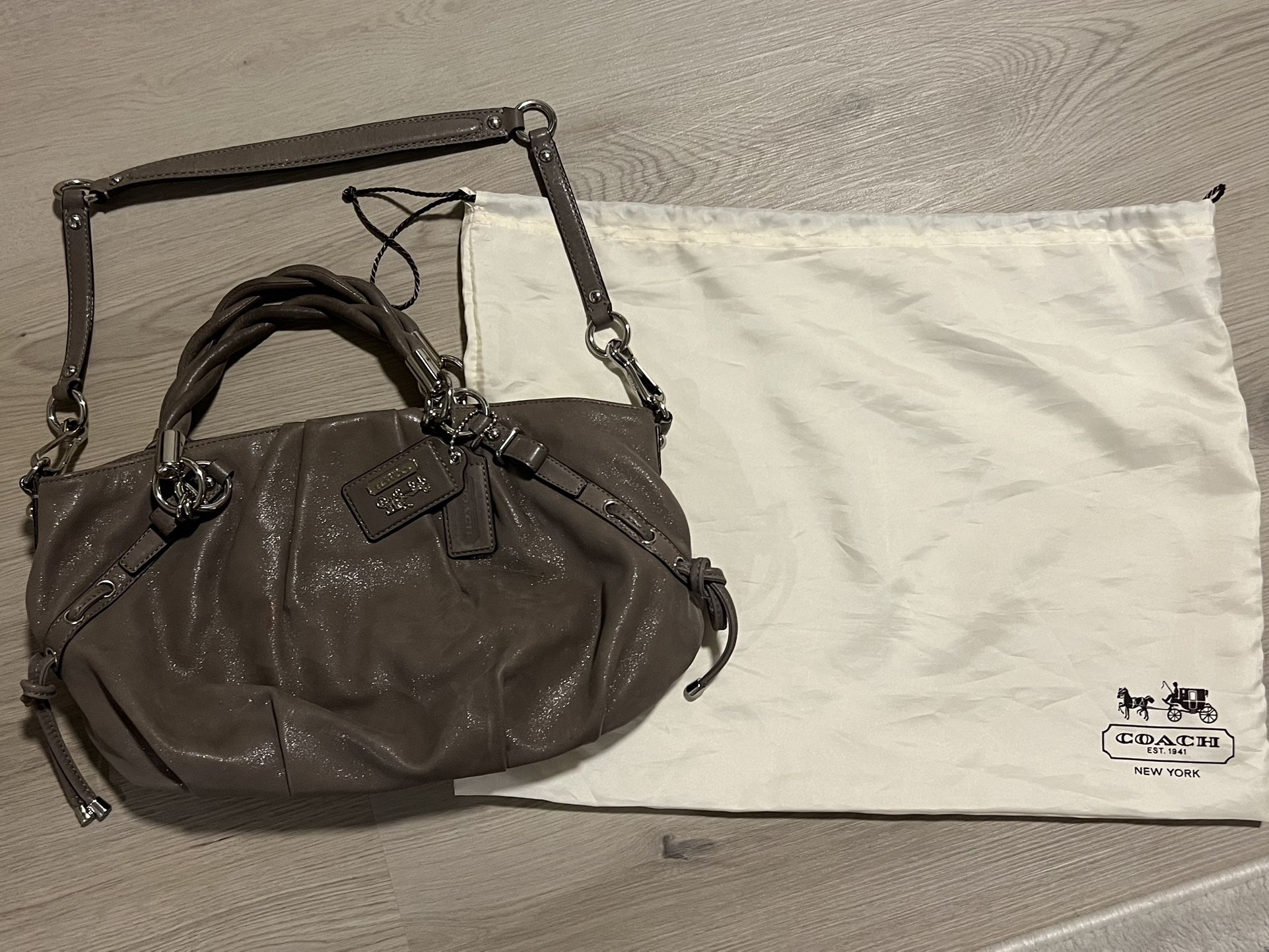 The Coach Madison Flint Leather Pleated Patent Leather Juliette Satchel is a stylish and versatile handbag for women. Made of luxurious leather with a solid pattern and pleated accents, it features a rectangular shape and a zip closure. The medium-sized satchel also includes inner pockets and comes with a detachable strap for added convenience. In a lovely lavender gray exterior color, this Coach Madison Juliette satchel is a chic addition to any outfit, perfect for everyday use or special occasions. It typically includes a top handle with a 5" drop and an adjustable crossbody strap with a 26 3/4" drop, allowing for multiple carrying options. Style # 17773 Interior color: Purple Retired Style. Excellent condition. Dust bag included. Pick up & Shipping available.