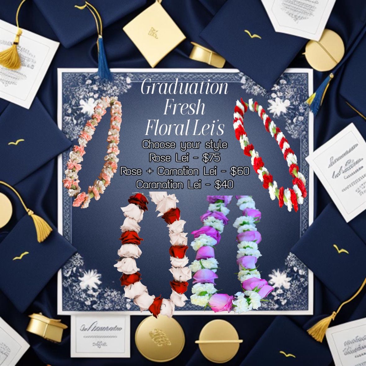 Graduation leis available made of real roses and carnations. PetalsNThorns_ instagram