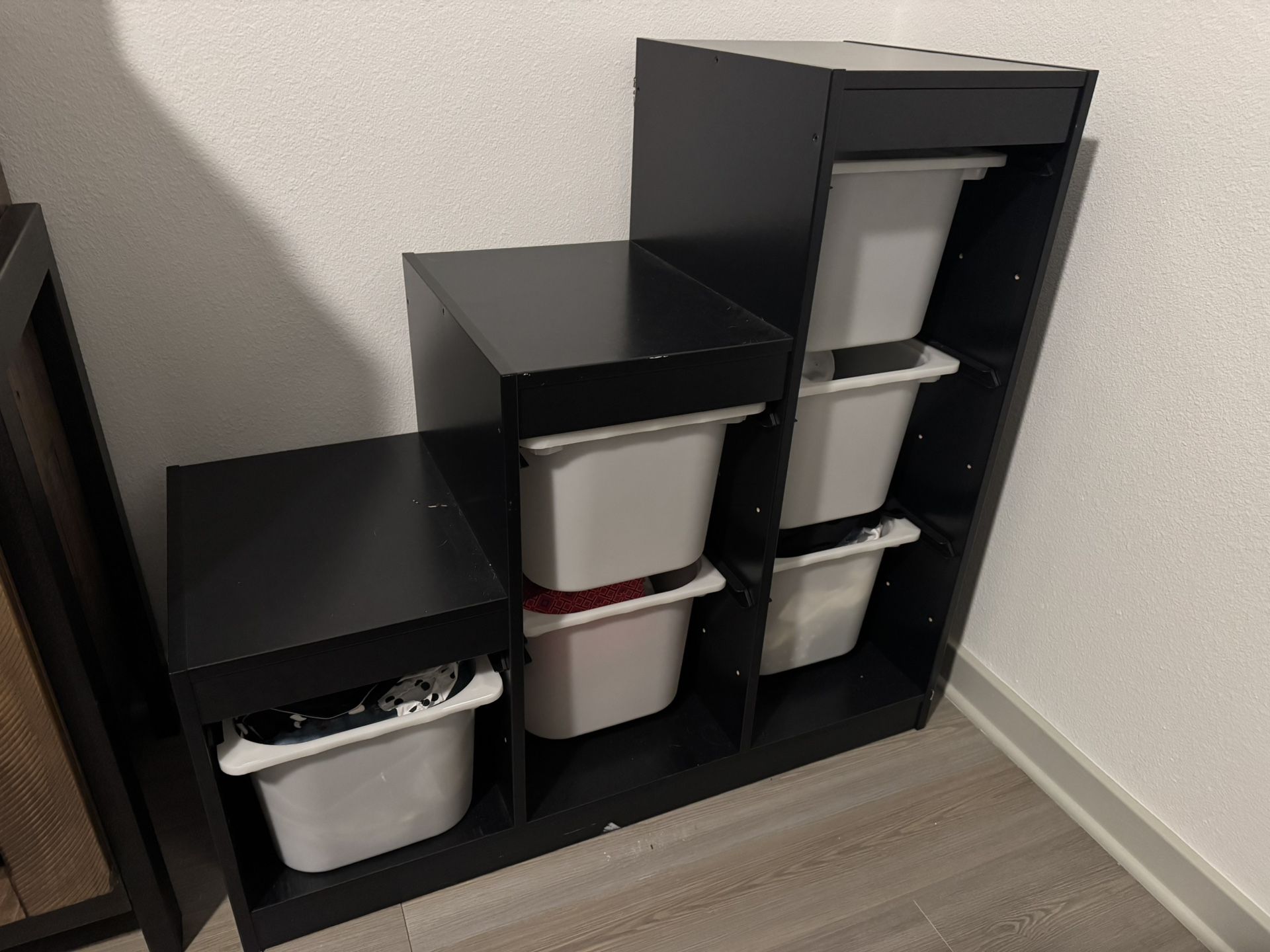 Some scratches. Used. Wood base and 6 plastic drawers. 39” wide, 37” high, 17” deep