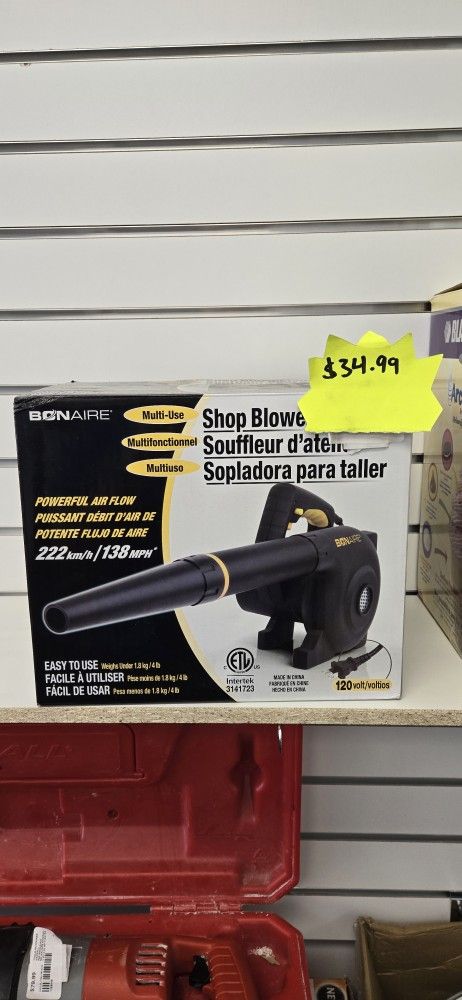 Bonaire Shop Blower For sale is a Bonaire Shop Blower, perfect for various cleaning tasks in your workshop or garage. This multi-use blower features a powerful airflow of 222 km/h (138 MPH) and is easy to use, weighing less than 1.8 kg (4 lbs). It operates on 120 volts and is in excellent condition, still in its original packaging. Price: $34.99. Feel free to message me for more details