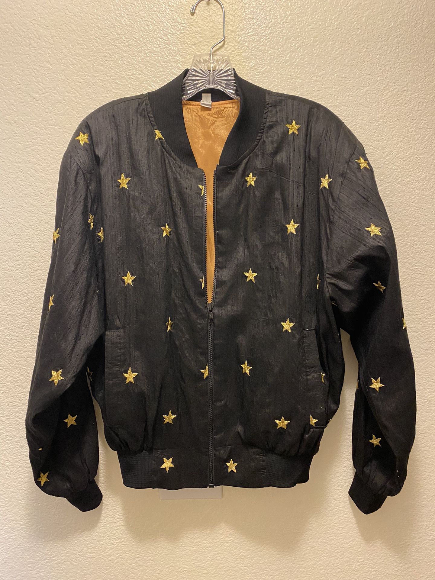 Vintage bomber jacket. Size Medium. Made in USA. Black with gold stars. Two front pockets. Zipper front. Length is 26” long. Elastic waist. Ribbed sleeve cuffs. Small padded shoulders. Very good condition. No stains of holes. Porch pick up Issaquah near Costco. Exit 13 off I-90.