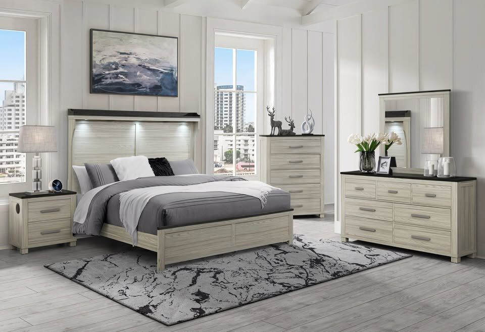 Features: modern designed bedroom set w/smart technology Available in queen & king size beautifully crafted set combines rich, cool wood tones headboard features 3 Built-in lamps lights, bluetooth speakers, USB ports & more Night Stand features Speakers & Charging ports designed with functionality and elegance in mind 6 pc bedroom set Sale Price @ $1399.00 (Includes: Queen HB + Queen FB + Queen Rails + Night Stand w/Speaker & USB + Dresser + Mirror) Additional casegoods can be purchased at an extra cost We offer various finance plans $39 down same as cash with no interest for 90 & 100 days. Longer financing plans are also available. Lowest prices, great quality products and exceptional service guaranteed. We also have a wide range of other living room, bedroom and dining room products to choose from at highly affordable prices. For buying visit Splendid Furnishings located at 4073 Lavista Road, Suite 311, Tucker GA 30084 or call 470-269-9301.