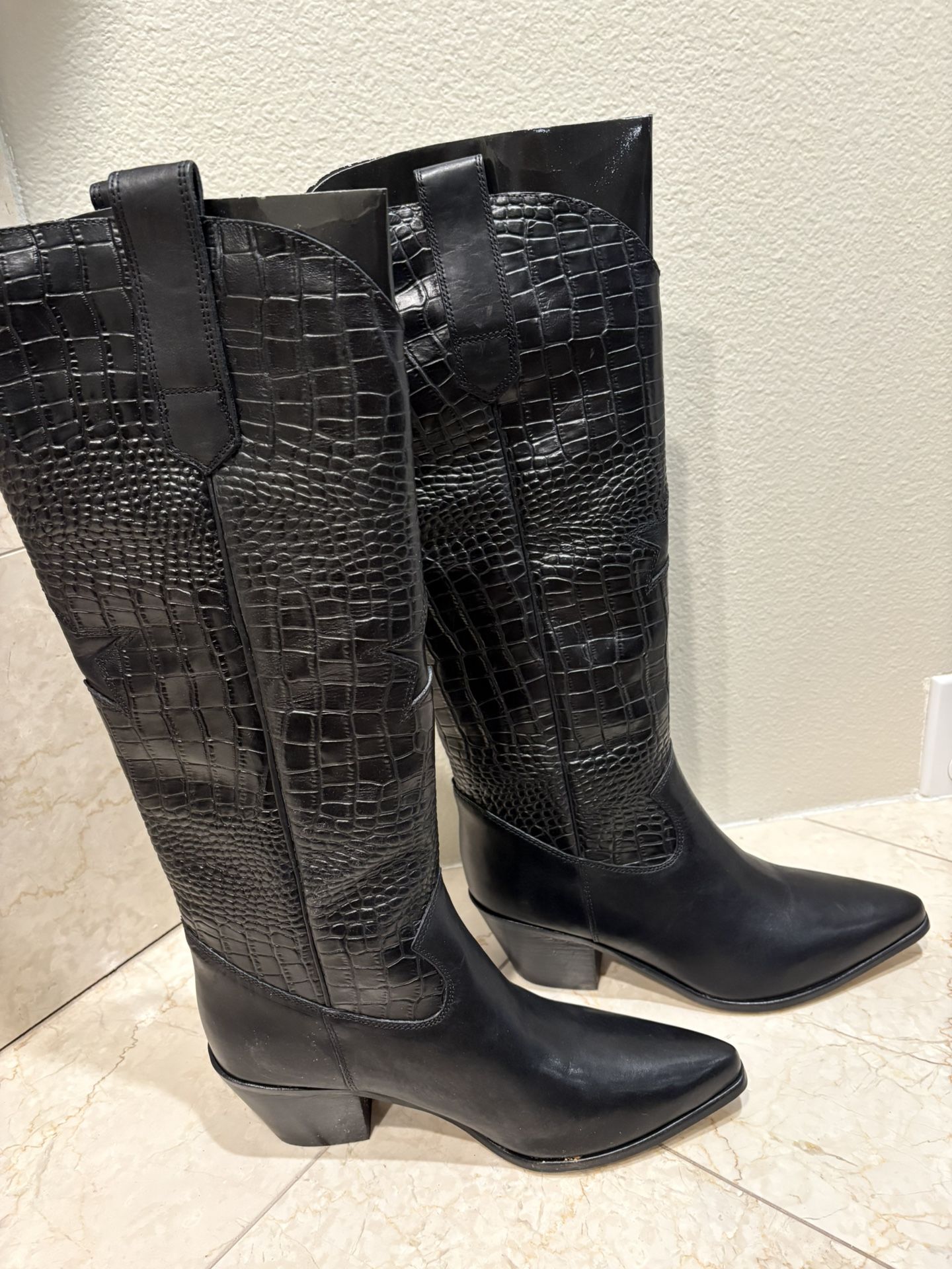 SEYCHELLES Admirable Tall Cowboy Women's boots Black Leather Croco size 7. The SEYCHELLES Admirable Tall Cowboy Women's boots in black leather with a croco finish are a stylish and versatile addition to any woman's wardrobe. Featuring a pointed toe, pull-on closure, and a stacked heel measuring 2 inches, these knee-high boots are perfect for casual occasions year-round. The intricate star accents and cowboy theme add a touch of flair to the Western-style design, while the leather and fabric lining and leather insole ensure comfort and durability. Made with man-made outsole material, these boots are a must-have for women who want to make a statement with their footwear.