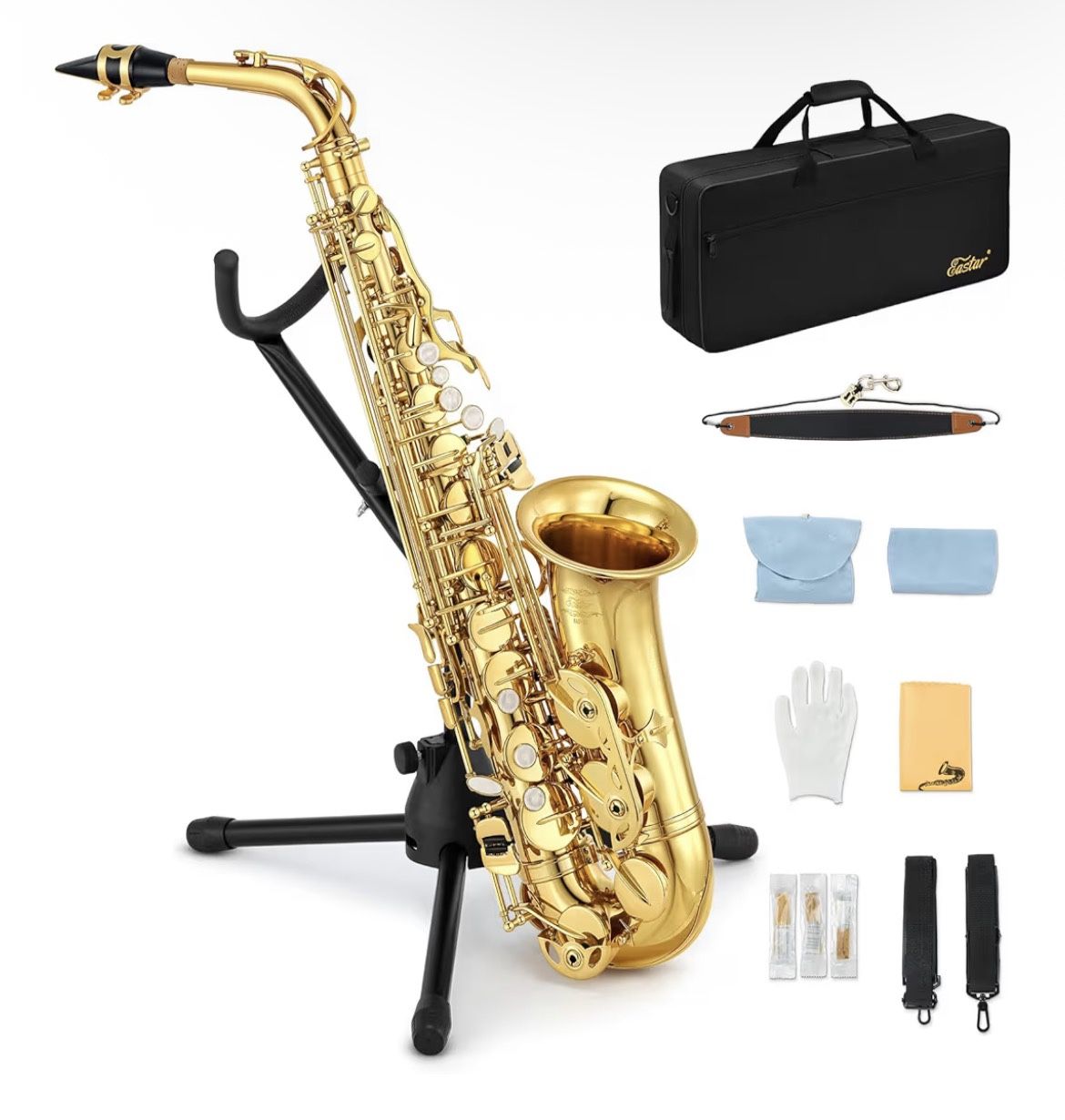 Full Kit with Carrying Case, Mouthpiece, Straps, Reeds, Stand, Golden Lacquer, AS-Ⅱ. Beautiful Sound - professional tone adjustment before leaving factory, excellent sound quality without noise, pleasant surprise. No pressure from low to high gamut range transition. Top Material - instruments dedicated copper, lead-free welding green craft, feel free to use. Advanced imported leather pads, high air tightness, Imported blue copper needle spring, moderate elasticity, not aging, high feedback when finger pressing. Amazing look - Eastar AS -Ⅱ: Transparent lacquered gold, multi-layer painted,durable and barely to fade color. Faux mother of pearl inlaid keys are simple and generous. The handcrafted carvings of the bell mouth makes AS -Ⅱ perfect even more perfect Practical Design - Full bounding key stick gasket for longer life and better pressing feel. Keystroke link: all being applied oil for debugging before leaving the factory, preventing the link from rusting and getting stuck.Setting the F# key to suit the performance.The U-tube of the bass is adopted: Eastar has accumulated crafts experiences for many years to improve the stability of the bass and achieve a stable feeling of playing and resistance.