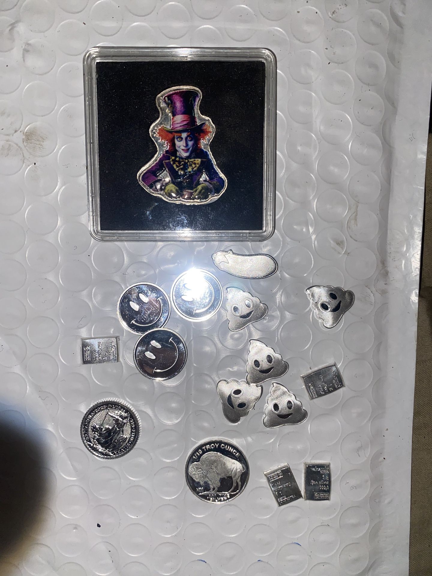 One color eyes Alice in wonderland, 5 g mad hatter 13 individual 1 g silver pieces and two 1/10 ounce silver coins