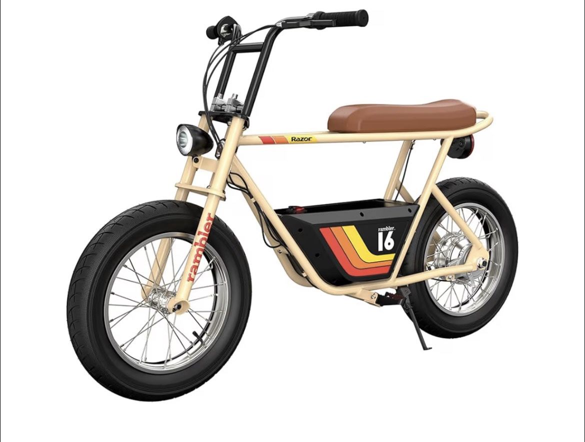 Brand new Razor Rambler 12 seated electric bike in the tan color. The box has never been opened and the bike has never been used. Still factory sealed. Features: • Up to 14 mph top speed • 12” air-filled tires for a smooth ride • Seated mini electric bike style • Good for teens and adults • Classic retro design $320 OBO Local pickup only