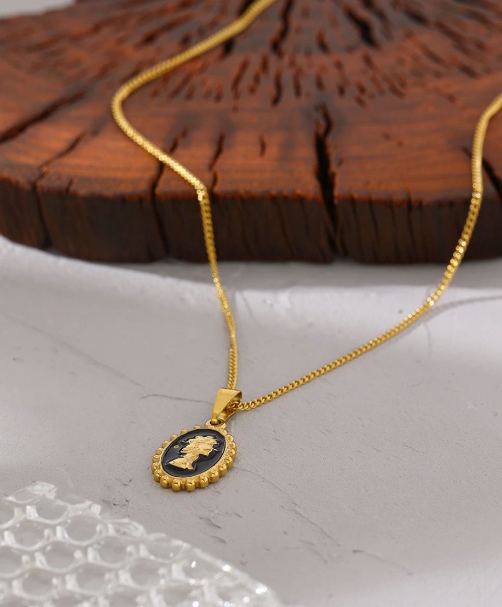 N106- Round Enamel Portrait Pendant Necklace LENGHT - 16 inch + 2extra MATERIALS : Stainless Steal COLOR : Gold BAND COLOR : Gold Stone: Portrait LIGHTWEIGHT NICKEL FREE WILL NOT TARNISH HYPO-ALLERGENIC Necklace is perfect to wear everyday and add a precious touch to your daily outfits. They are perfect to wear alone or stack them with the ring Wearing Occasion: Wedding / Engagement / Anniversary / Propose / Party / Gift Gift for: Girl friend / Wife / Mom Jewelry maintenance: Avoid chemicals / Avoid bathing / Avoid sweat / Avoid chafing / Avoid moisture / Wipe with a soft cloth / Keep well / Replace wear We do bundle ask us about the price please