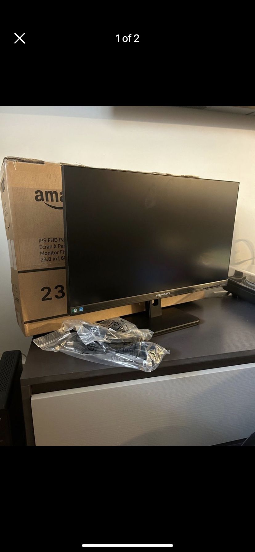 Brand New Still in Box First picture is a stock photo Amazon Basics 24 inch Monitor Powered with AOC Technology FHD Full HD 1080P 75hz VESA Compatible Built-in speakers Black Screen Stand tilts gaming monitor, work computer