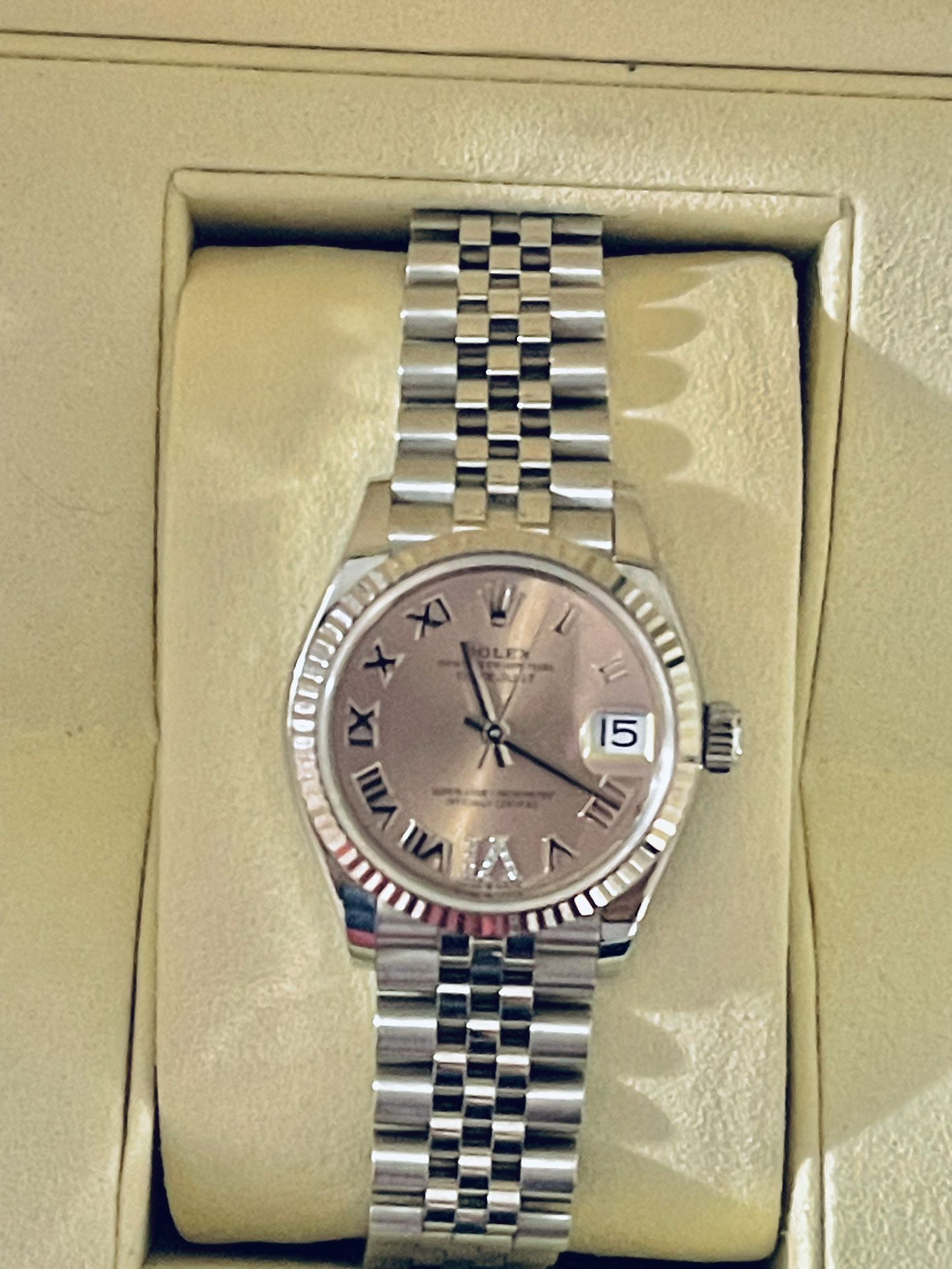Beautiful 31mm Rolex Datejust 2022 with roman numerals pink dial, including the elegant factory diamond roman numeral VI. Also, an 18k white gold flutted bezel and steel jubilee bracelet adorns this timepiece. Other than a few surface scratches on the bracelet, consistant with being worn a few times, it is in excellent condition. Comes with original box and booklet. 100% authenic. Willing to meet at any reputable jeweler and/or watchmaker of your choose, for your own piece of mind. So shop confidently.