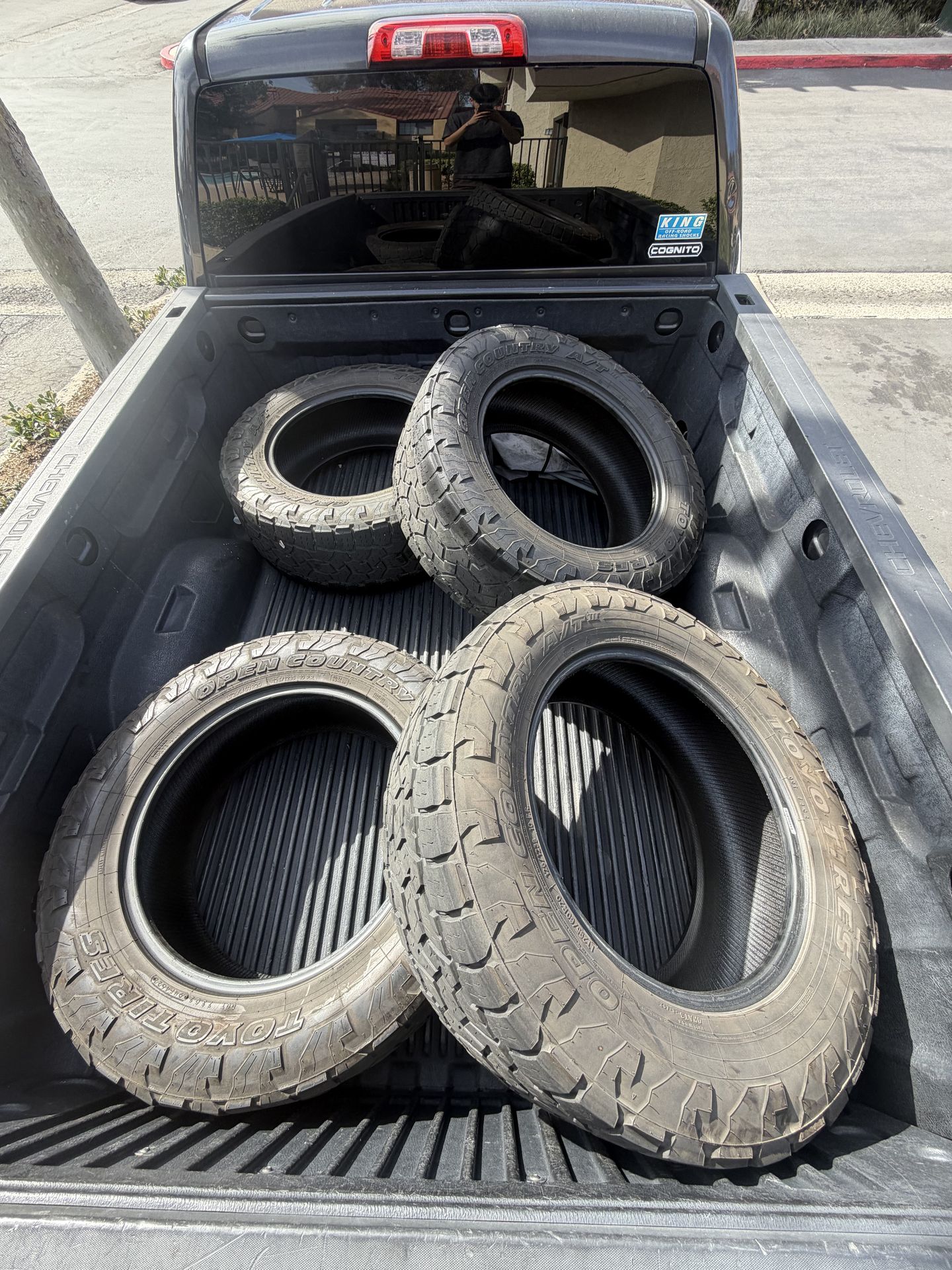 295/60R20 Toyo tires, has some good life left to them. (2 are pretty bald on one side due to bad alignment, other 2 are in good condition. I also have a video showing the tread on each tire but it wouldn’t let me put it on the listing. Need gone ASAP, open to offers. -Hablo Español tambien