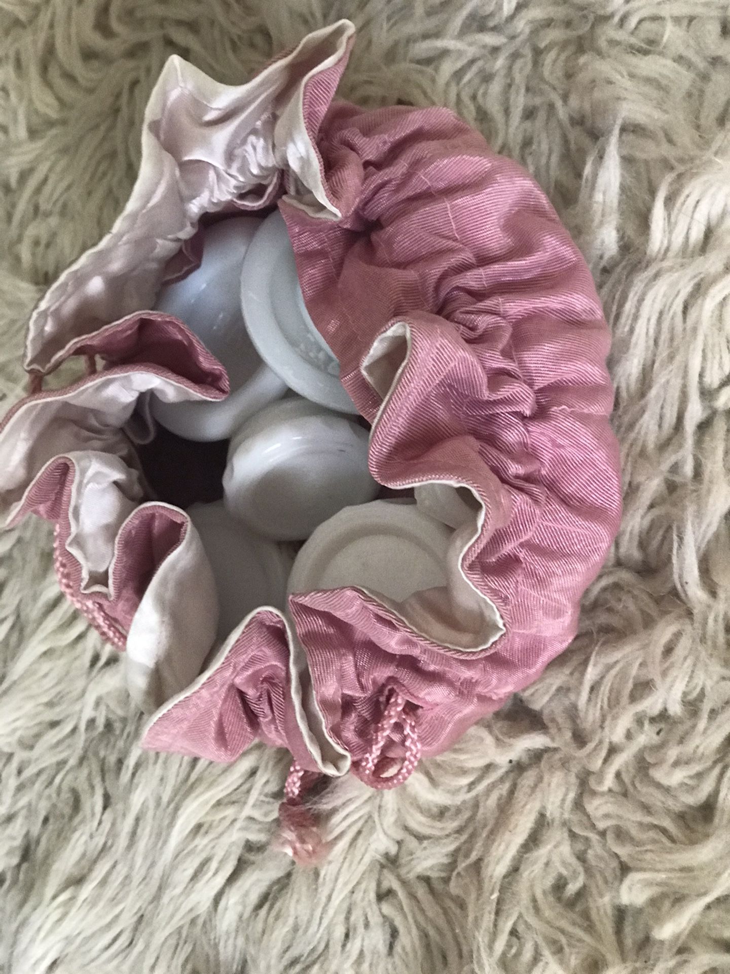Very old cosmetic jars in a pouch