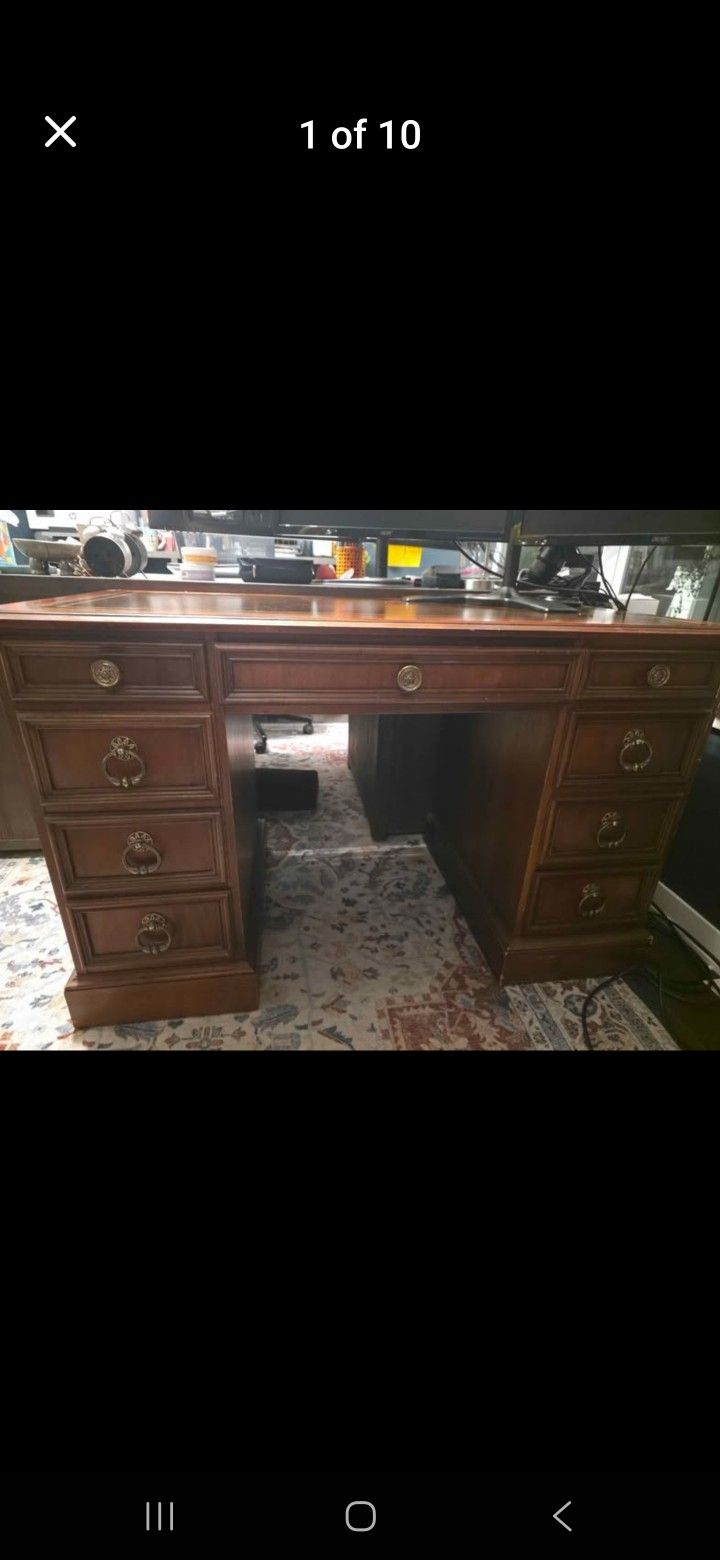 Hekman vintage desk, one owner. Non smoker. 48 in x 25 in x 29.5 in Vintage Hekman Twin Pedestal Desk – Leather Top – l Beautiful vintage Hekman solid wood twin pedestal desk with an elegant genuine leather inlaid top. This piece is high-quality, sturdy, and built to last — perfect for a home office, study, or statement workspace. Features: Classic Hekman craftsmanship Twin pedestal design with tons of storage Genuine leather top with gold tooling Smooth-gliding drawers Rich wood finish Very solid and well cared for.