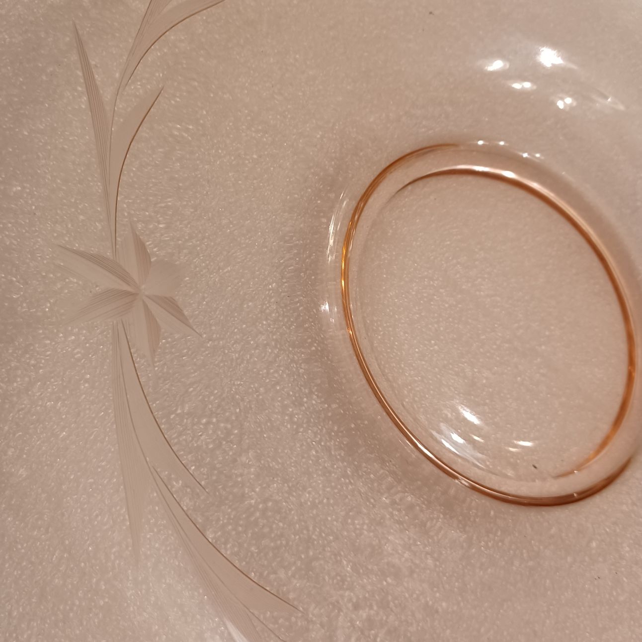 A light pink octogon platter with etched floral design. Depression style glass.