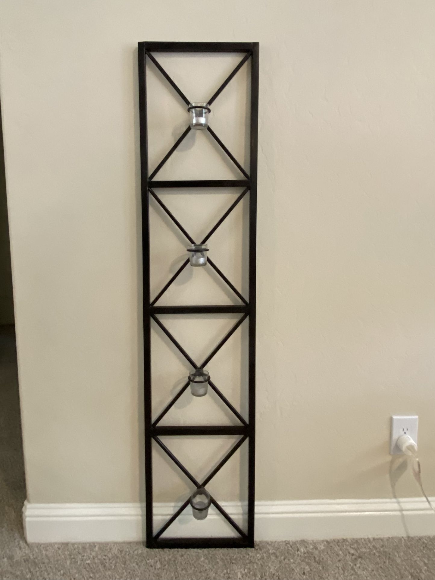 Bronze metal four tea, light candle holder. This beautiful candle holder looks brand new and can go in any room. It is 61 inches tall and 13 1/2 inches wide. It also includes built-in, mounting holes in the back to be hung on the wall.