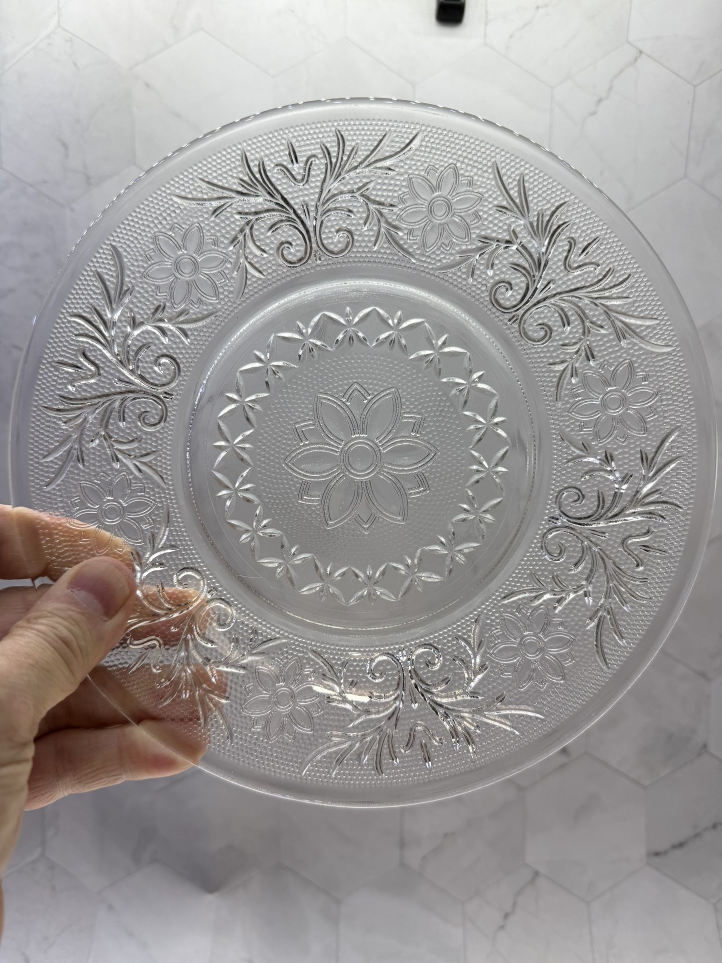 (1) Vintage Anchor Hocking plate in the "Sandwich" pattern that is 7 3/4 inches in diameter. This size is often described as a luncheon or salad plat