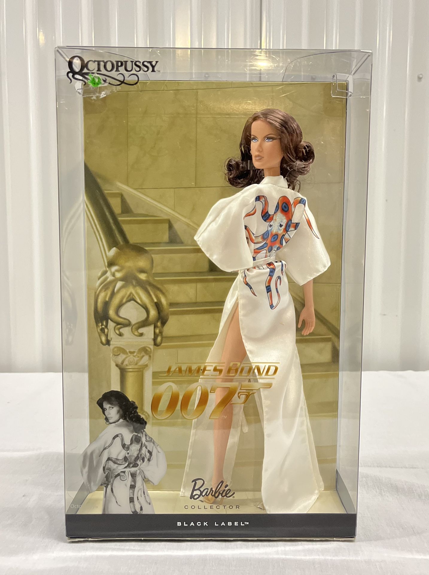 The 2010 Barbie Collector Black Label Octopussy Doll (T455) is a 11.5-inch fashion doll from the "Barbie Loves Bond" collection, designed by Linda Kyaw. This collectible, inspired by the 1983 film, features the character in a white, belted satin robe with a gold octopus graphic on the back, gold heels, and a bracelet. It is a sought-after, adult-collector item NRFB (Never Removed From Box).
