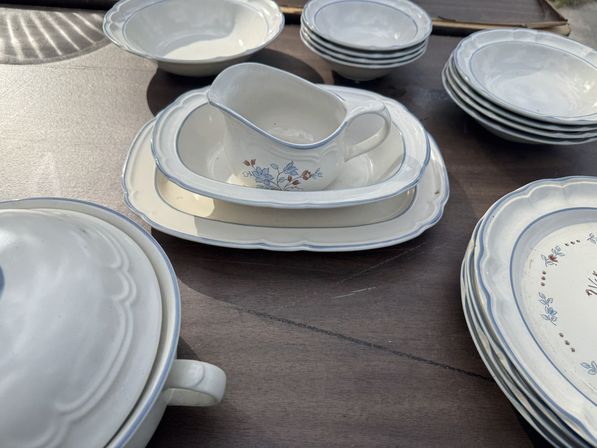 Includes soup bowl with lid, meat platter, two serving bowls, four dinner plates, four soup bowls , four salad plates, gravy boat, four desert bowls. Very nice set of stoneware. Located in connaminson