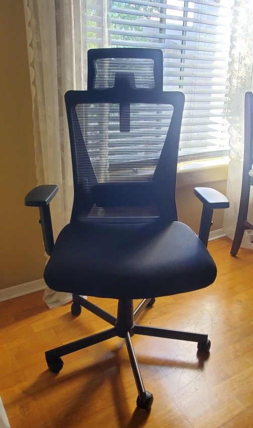 Black ergonomic mesh office chair with a headrest and adjustable armrests.