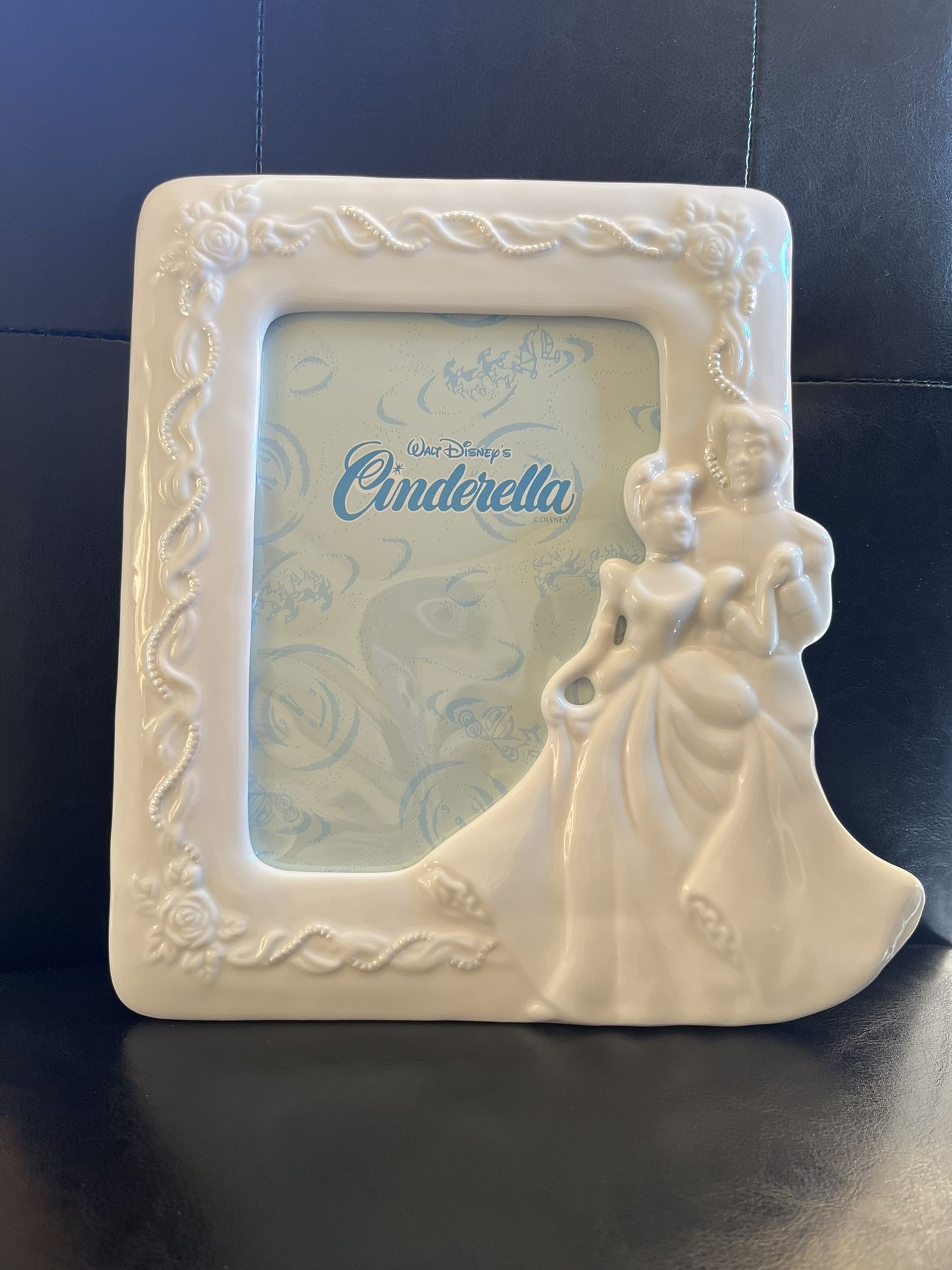 Brand new. White Cinderella and prince charming ceramic frame fits 5 x 7 photo..