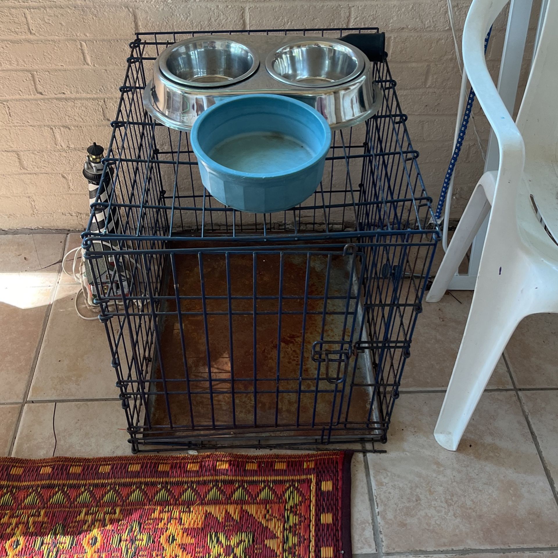 Great older crate for medium or small dog! Folds down to store. Bowls and gear included🐶🌸!