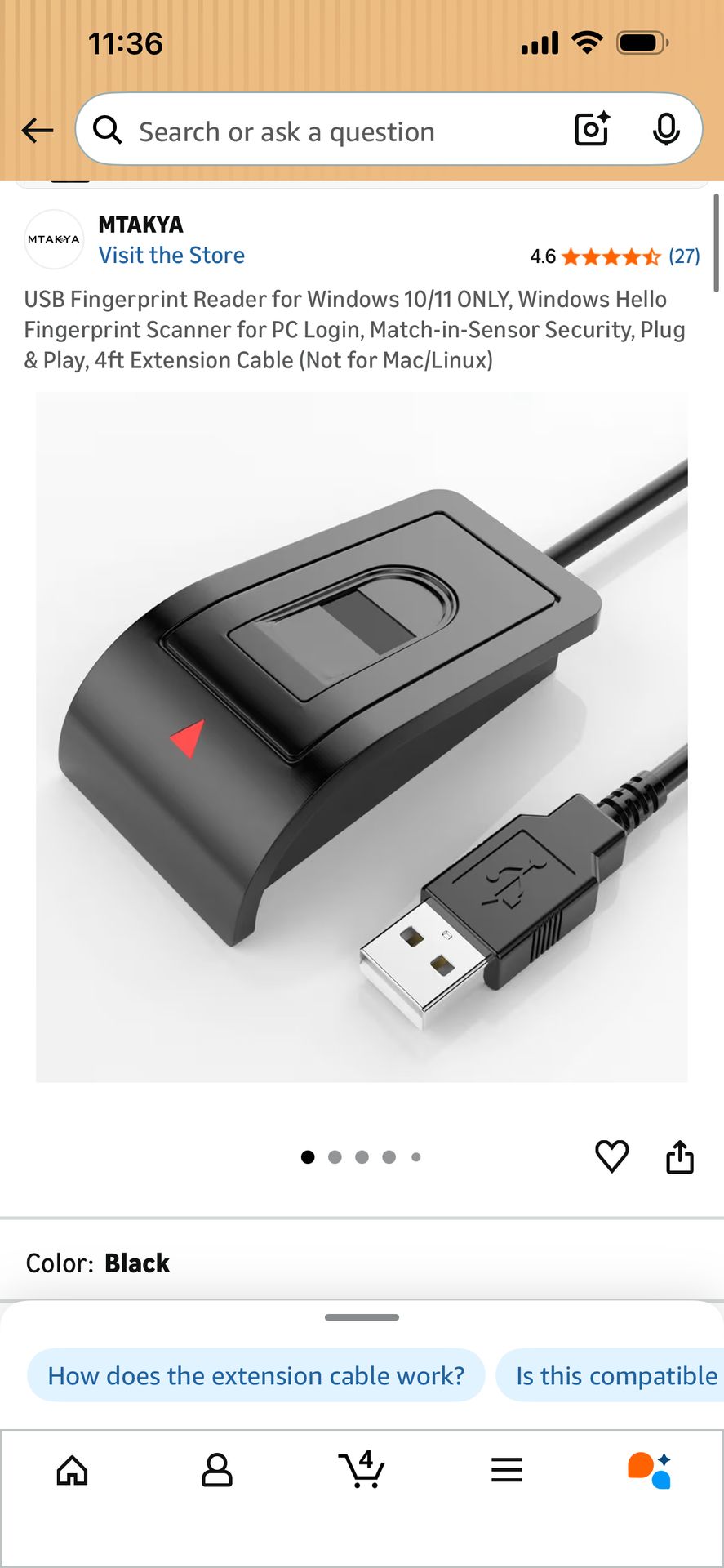 USB Fingerprint Reader for Windows 10/11 ONLY, Windows Hello Fingerprint Scanner for PC Login, Match-in-Sensor Security, Plug & Play, 4ft Extension Cable (Not for Mac/Linux)