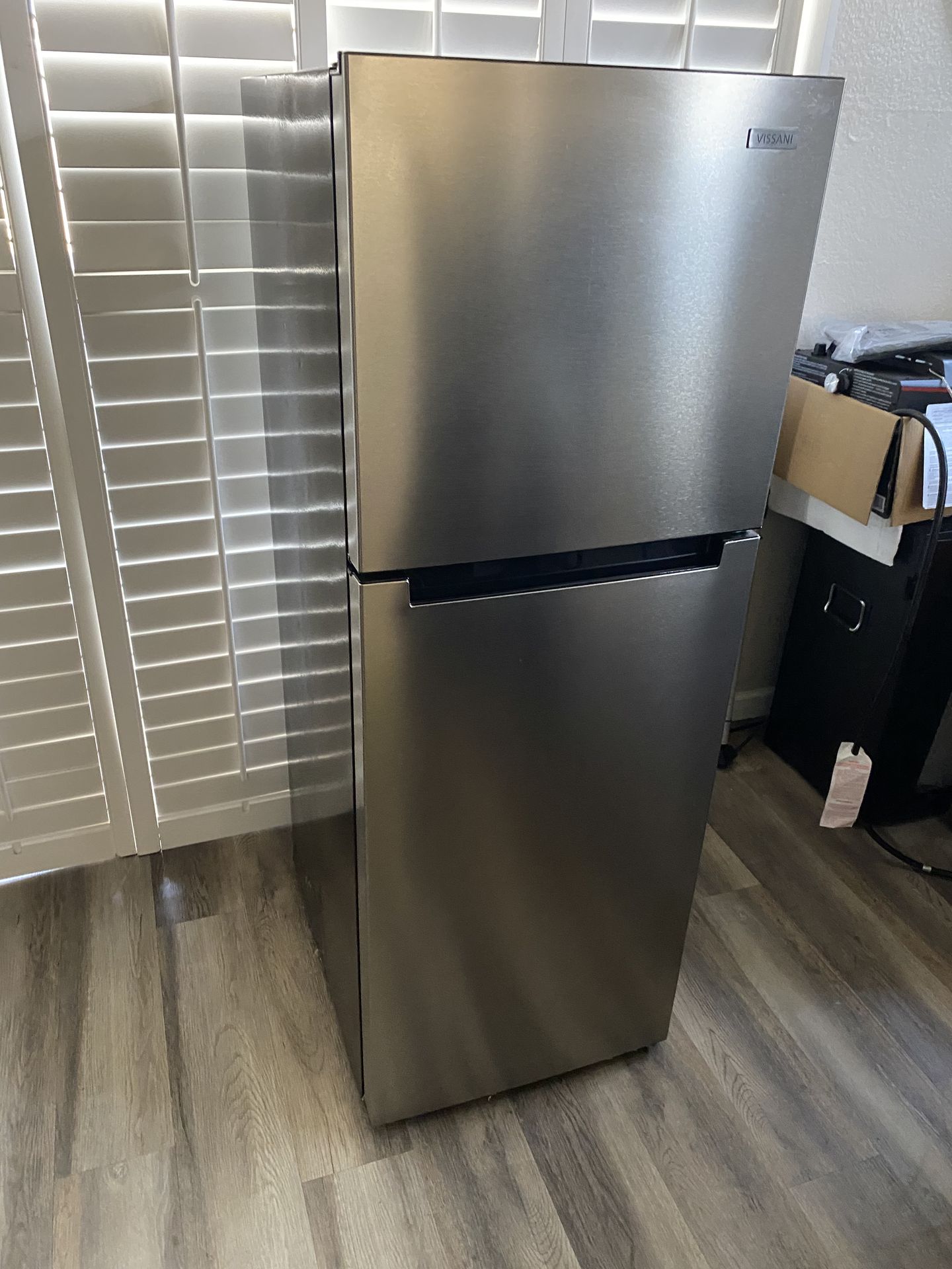 Retails for $500 Tested works perfect no issues Vissani 10.1 cu. ft. Top Freezer Refrigerator in Fingerprint Resistant Stainless Steel, Garage Ready H59.92” W21.46” D27.28” • Adjustable electronic temperature control system in fridge room • ENERGY STAR certified for year-round savings • Total no-frost design • Adjustable glass shelves in fridge room • Adjustable wire shelf in freezer room • Gallon door storage for larger beverages • Recessed handle detail • LED light in fridge room • Clear door bins • Reversible doors • Stainless steel color finish • Leveling feet