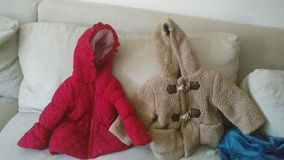 Brown fuzzy coat size 18 month-$8 fit my 2 year old. Red weatherproof jacket 2t- $10