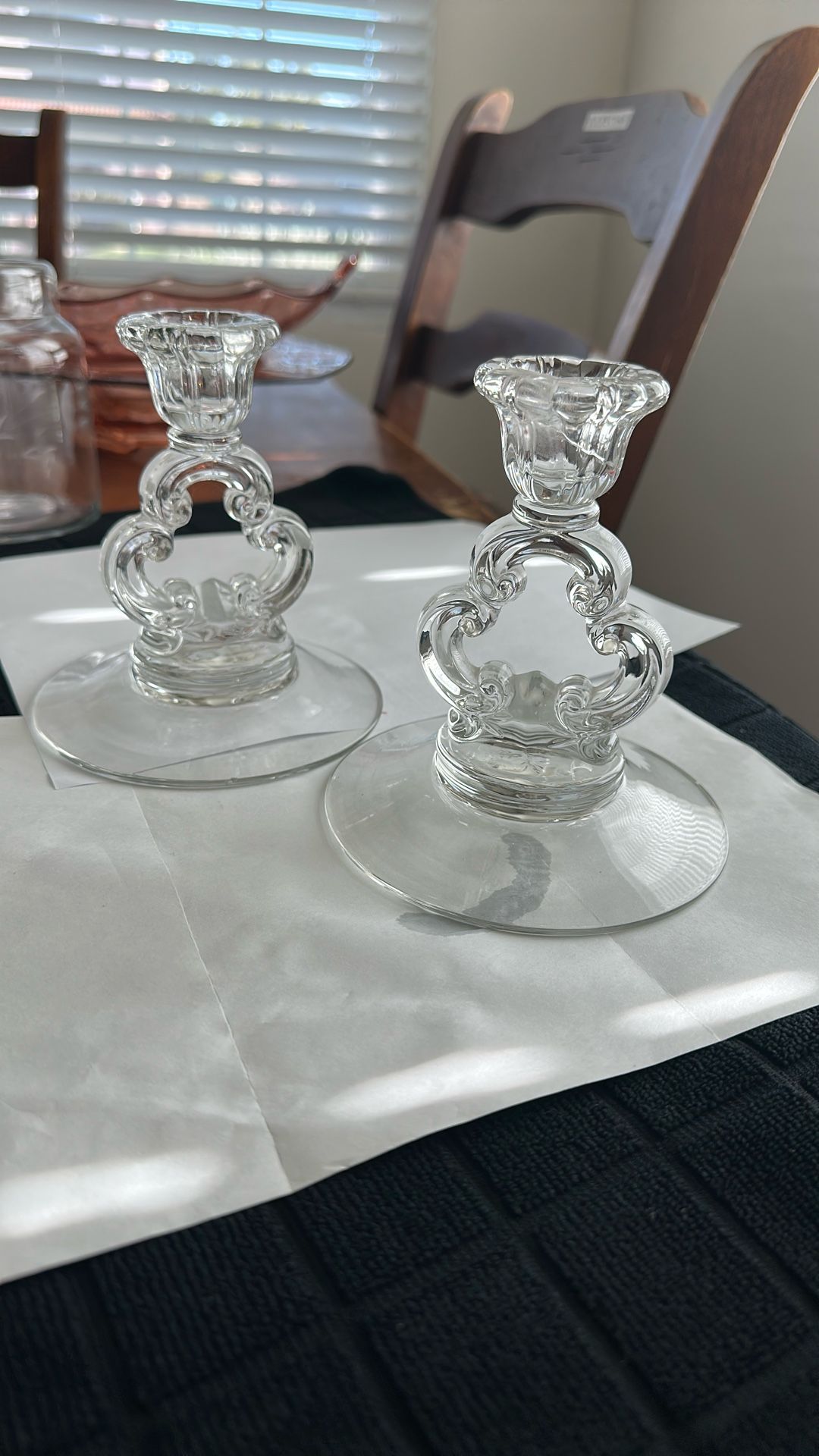 2 Cambridge Clear Glass Crystal Keyhole Single Taper Candle Holders 5.5” Has small cracks in glass where candle is inserted but hard to tell unless you really look at it. Otherwise beautiful. $10