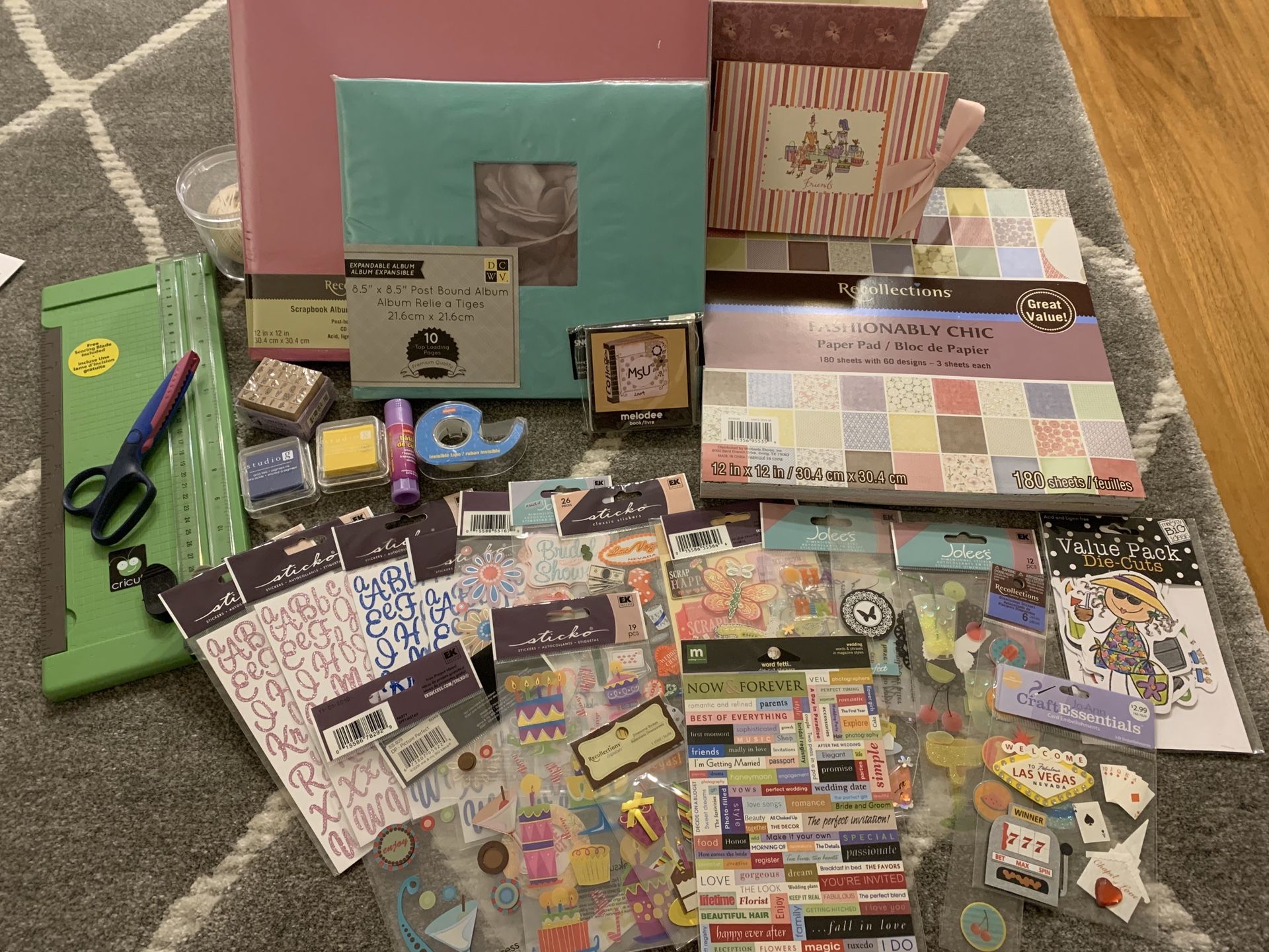 Selling new scrapbooking supplies. Perfect for beginners as this includes all the basics and more. Albums. Papers. Cricut cutter. Scissors. Stamps. Glue. Tape. Lots of various stickers. Includes box! Pickup only. Thanks!