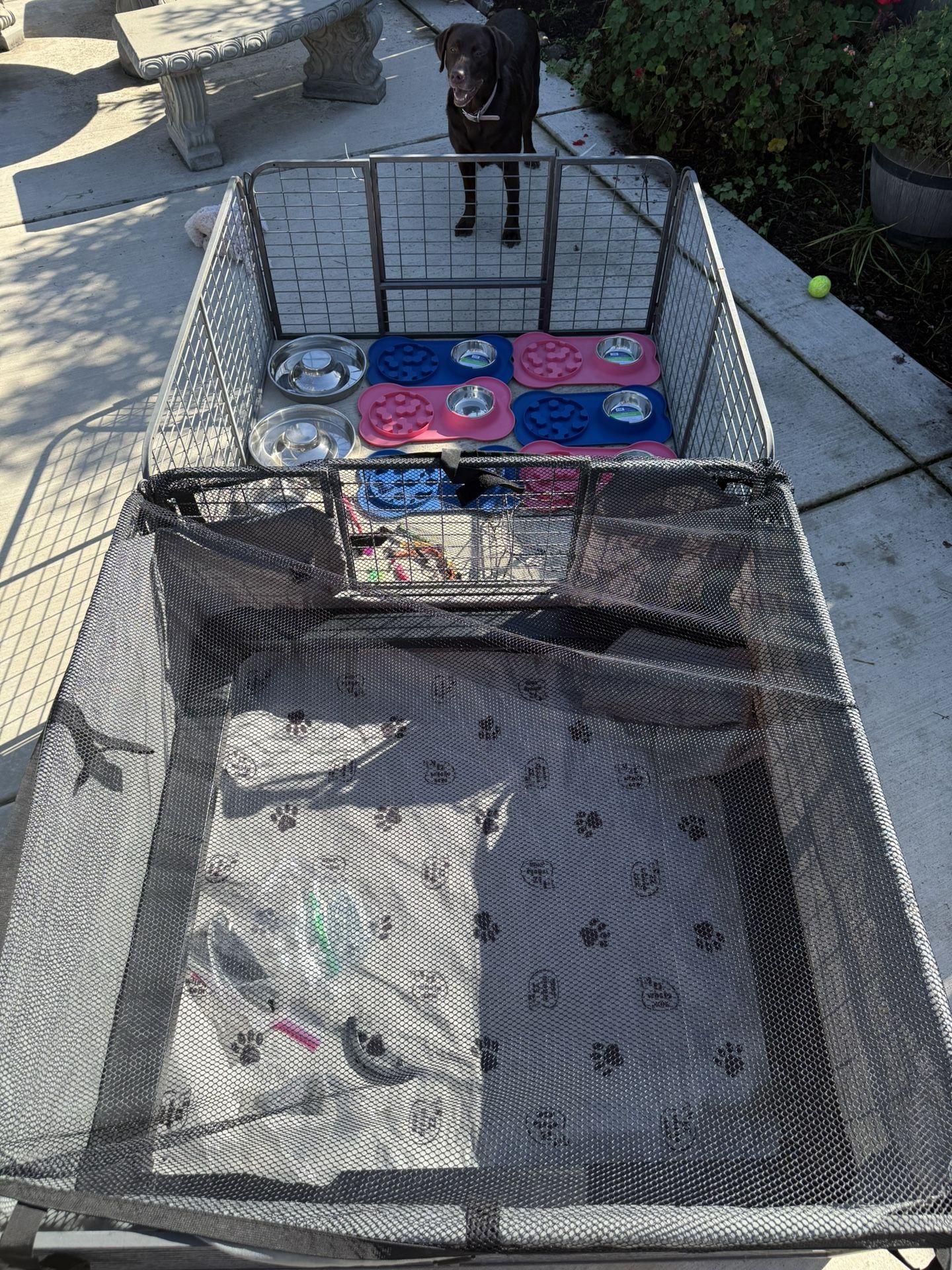 Complete Double welping pen with liner and top net cover, with hardware and extra zip-ties, 6- individual puppy bowl feeders, 2- 12” puppy bowls Newborn puppy collars and 8 week puppy collars of different colors for identification. 1- puppy pee mat Other miscellaneous puppy stuff.