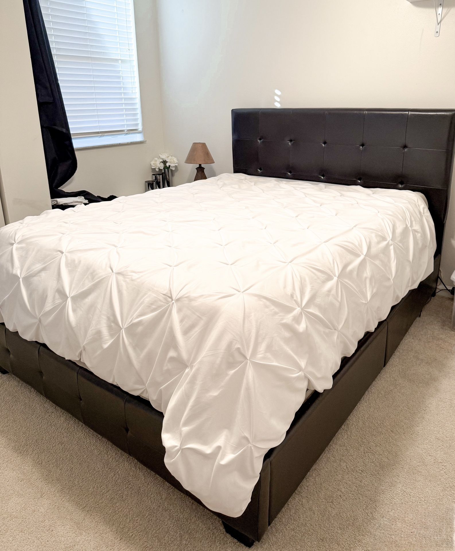 Faux Leather Queen Bed Frame + Headboard. Dark brown. Pre-owned. Good condition, besides a few scratches. *Must pick up and move in Boynton.* you will need 2 people. Thanks!