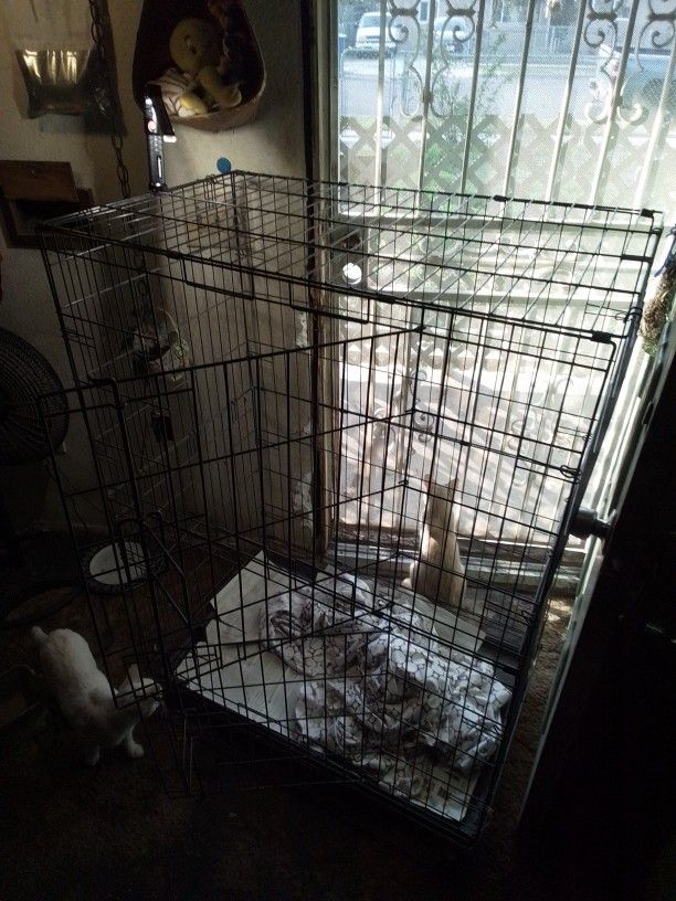 It folds to different sizes it also has two openings and a slide out tray on the bottom for easy cleaning it has 4 wheels with locking breaks