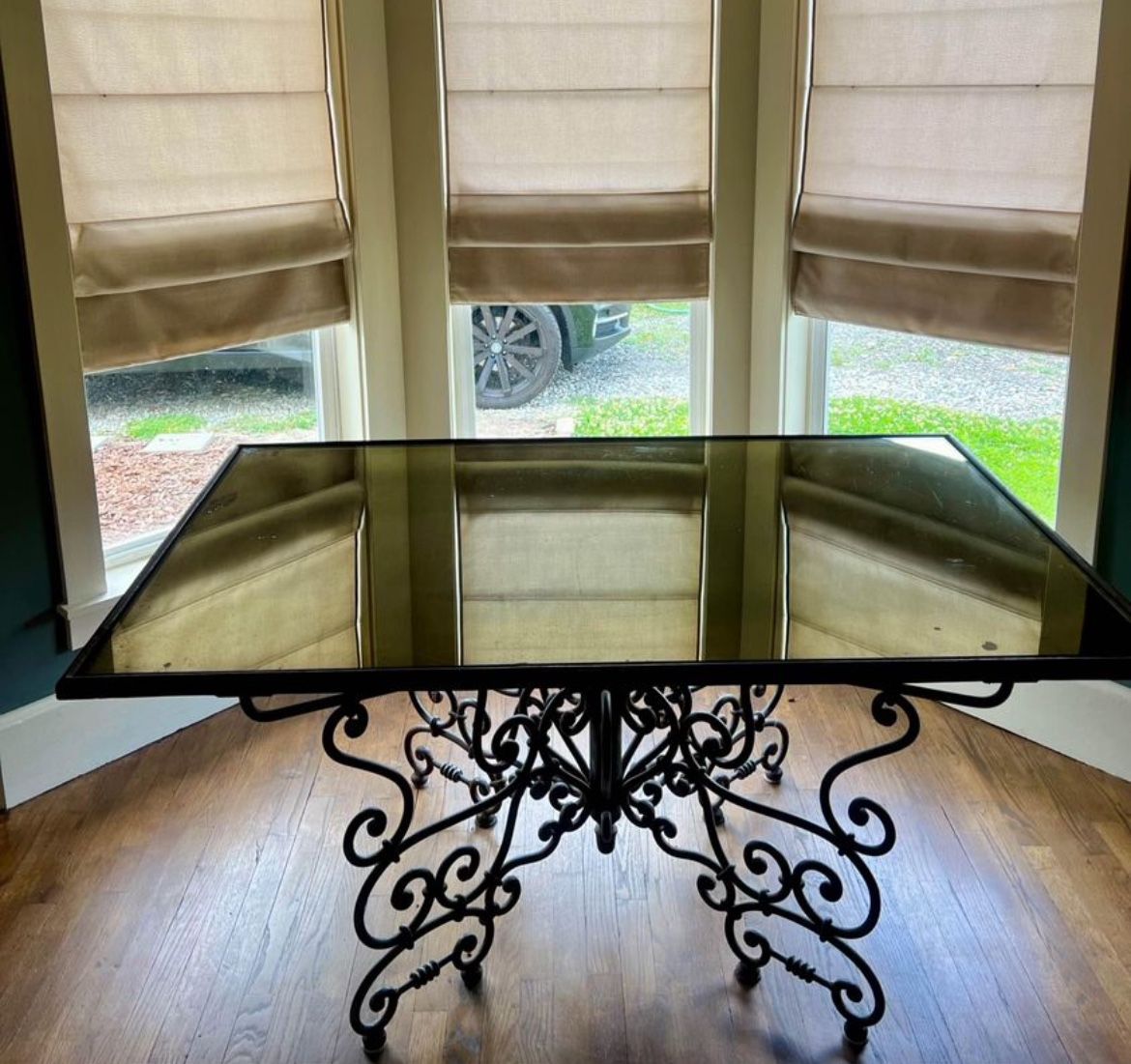 Stunning one of a kind antique wrought iron dining table from Anthropologie. 36” X 60” (3’ X 5”) 29” tall Gorgeous mercury mirrored glass top Color : Rust Brown / Bronze