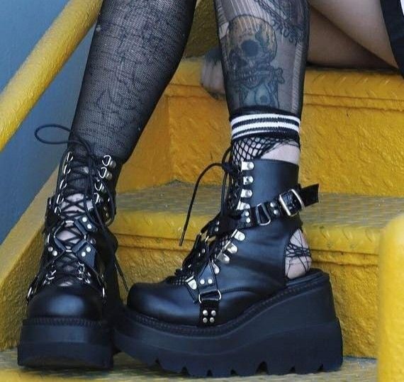 NEW Demonia SHAKER-56 Wedge Platform 4 1/2 Inch Open Back Lace-Up Ankle Boot The Demonia Shaker 56 Open Back Ankle Boot is a open heel combat boot with an adjustable studded harness. 4.5" (114mm) Wedge Platform Lug Sole. 4.5" Heel Closed toe Demonia SHAKER-56 Women's Lace Up Buckle Strap Wedge Platform Ankle High Booties 4 1/2" Wedge Platform Open Back Lace-Up Ankle Boot